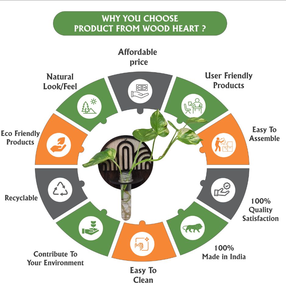 The WoodHeart™ ArchFlow Round Wall-Mount Test Tube Planter blends natural elegance with modern geometry. Featuring a circular MDF base with artistic arch and wave cut-outs, this wall-mounted planter beautifully displays plant cuttings or flowers in a clear glass test tube. Its compact and stylish design adds a touch of greenery to any wall, making it perfect for homes, offices, or cafés.