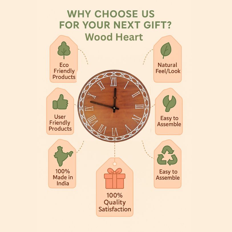 Bring timeless elegance to your home with the Classic Roman Numeral Wall Clock from Wood Heart. Made from premium MDF wood and styled with intricate border detailing and Roman numerals, this clock blends classic charm with modern craftsmanship. The minimalist round design complements both traditional and contemporary interiors, making it perfect for your home, office, or gifting needs.