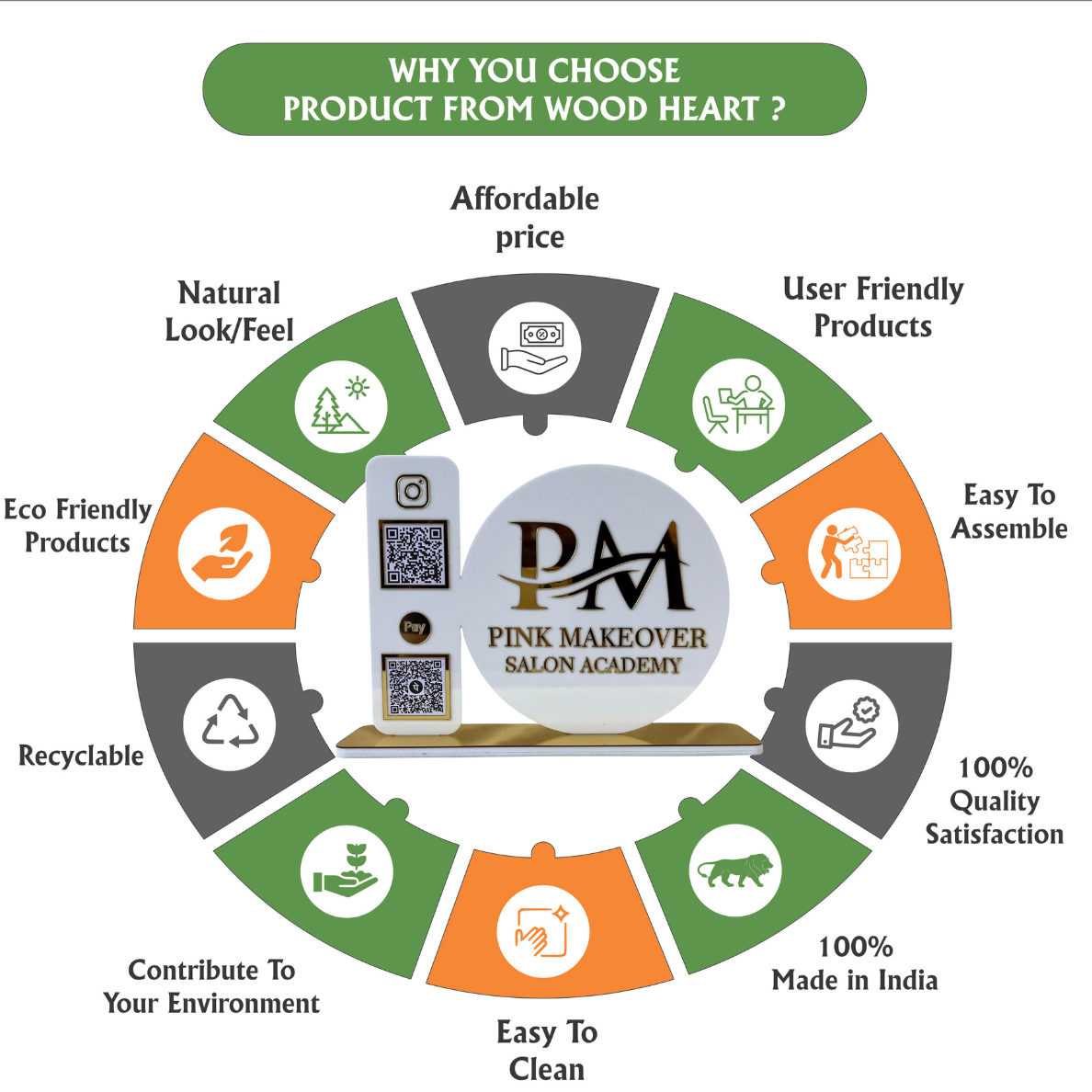 A stylish and functional dual QR code acrylic stand, designed to display both social media and payment QR codes in one elegant unit. Crafted for salons, academies, and boutique businesses, it features a round logo display, Instagram QR code for digital presence, and a payment QR code for quick transactions. The gold accents and premium acrylic finish give it a professional, high-end look suitable for reception desks and counters.