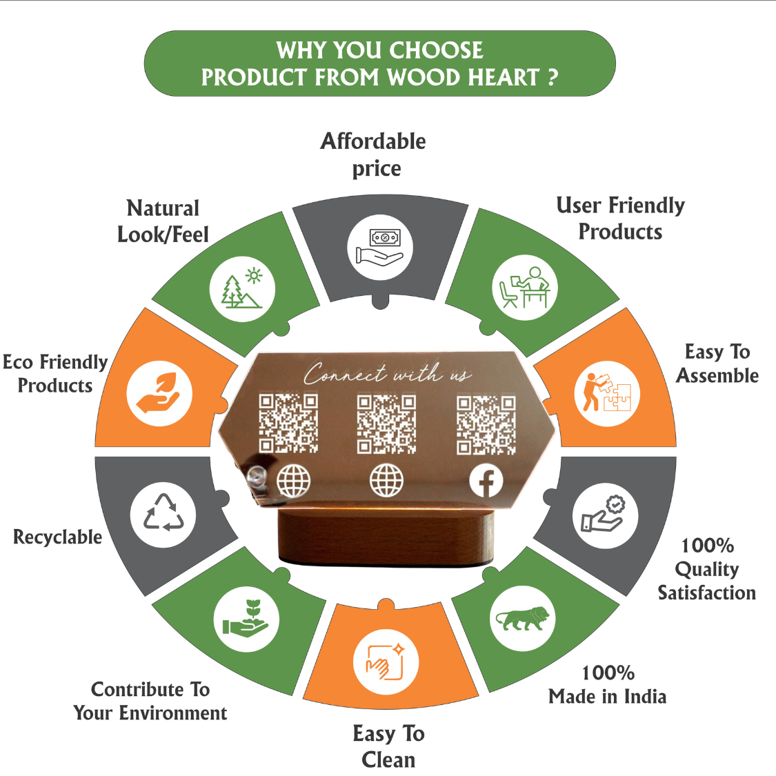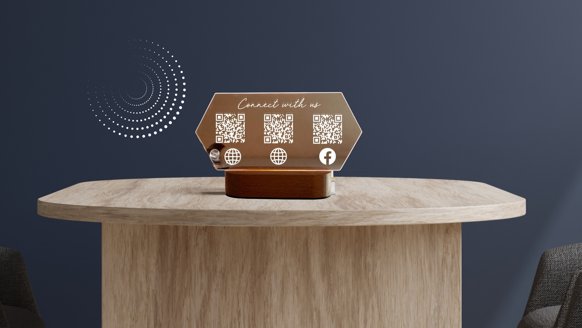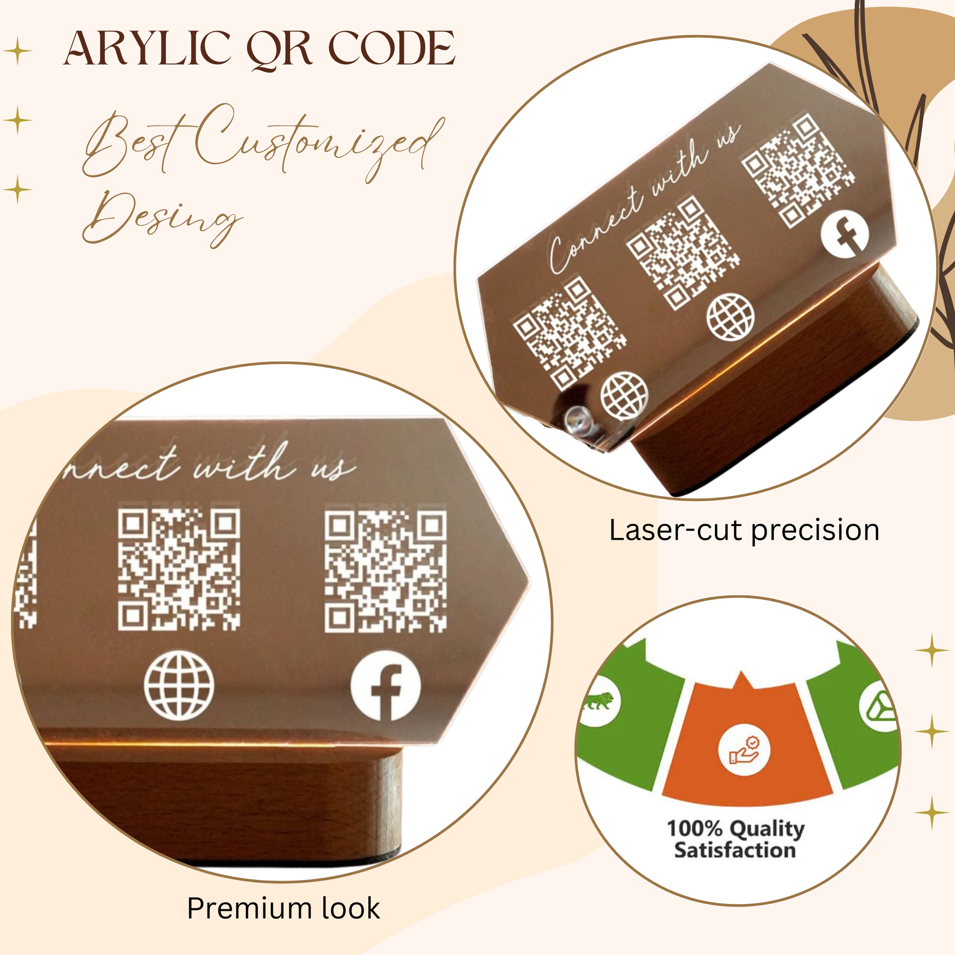 An elegant and modern acrylic display stand designed to showcase multiple QR codes for quick and easy customer connections. Perfect for cafes, boutiques, offices, or events, this “Connect with Us” stand allows customers to instantly access your website, online store, and social media pages by simply scanning the codes. The arrow-shaped clear acrylic plate paired with a wooden base creates a stylish yet functional piece for any counter or reception area.