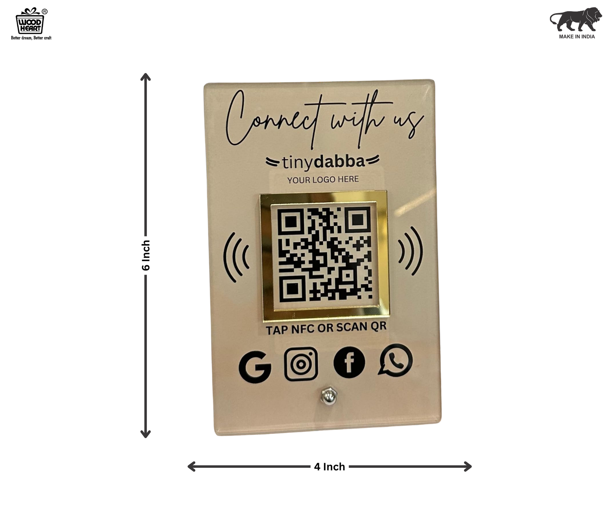 A modern and professional NFC-enabled QR code display stand designed for quick and effortless customer engagement. This compact sign allows users to connect instantly by tapping their phone via NFC or scanning the QR code. Perfect for cafés, retail counters, exhibitions, and service desks, it supports multiple social media and communication platforms like Google, Instagram, Facebook, and WhatsApp. The beige acrylic background paired with a gold-accented QR frame gives it a premium, classy look suitable for any business setting.