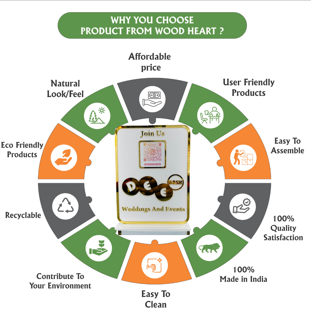 A luxurious acrylic display stand crafted for wedding planners, event organizers, and hospitality businesses to elegantly share their social media profile. Featuring a white acrylic background, gold-bordered edges, and a custom Instagram QR code, this stand offers guests a quick and stylish way to connect. The premium gold 3D lettering and logo enhance the visual appeal, making it perfect for receptions, event check-ins, and decorative displays.