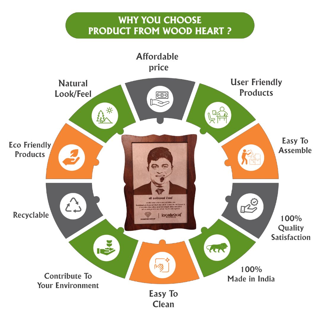 Celebrate achievements, milestones, and special moments with this Custom Wooden Engraved Photo Frame from Wood Heart. Expertly crafted from premium quality wood, this elegant plaque features laser-engraved detailing that beautifully captures portraits, text, and logos with precision. Its smooth finish and natural grain add a touch of sophistication, making it perfect for awards, recognitions, corporate gifts, and personal keepsakes.