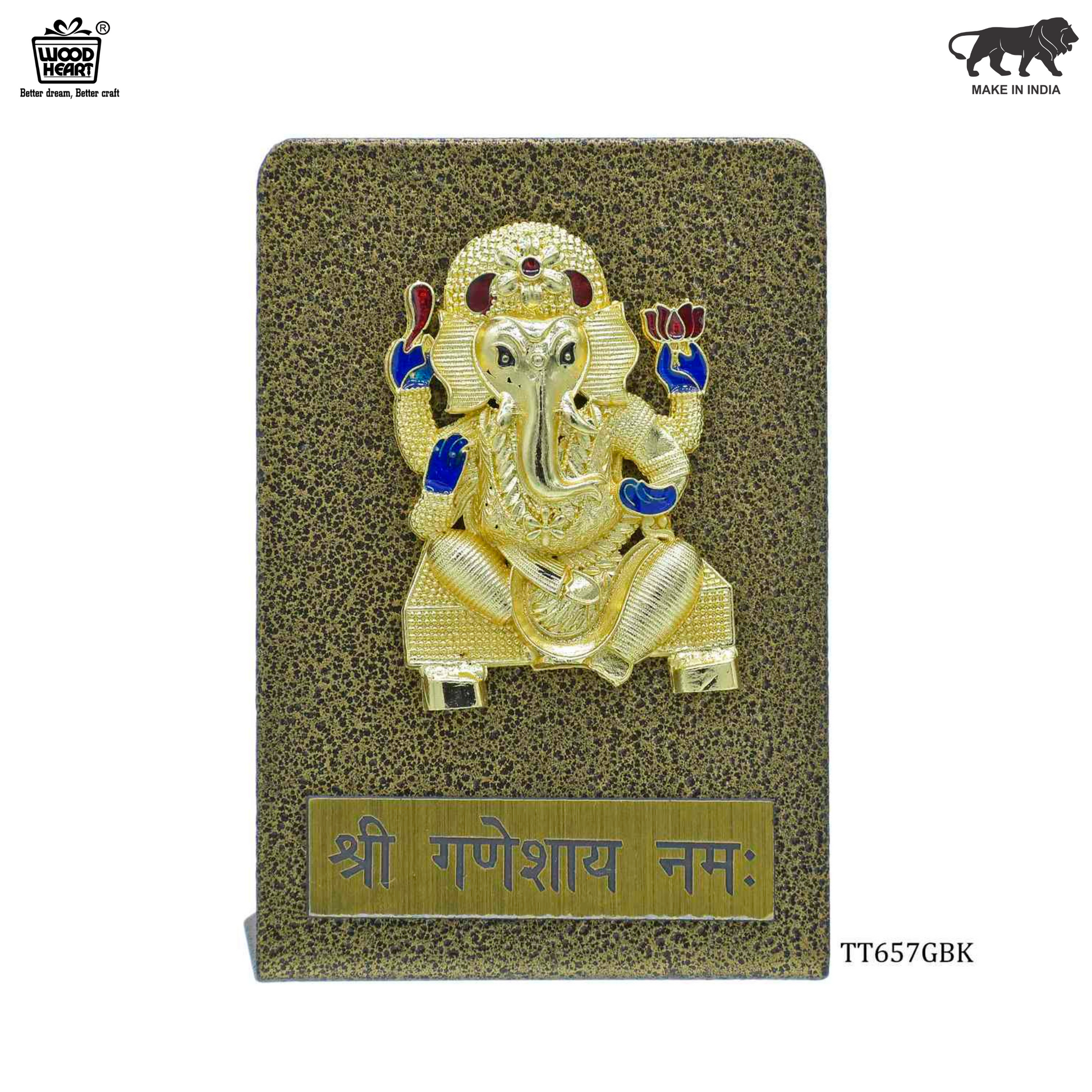 Invoke divine blessings and spiritual elegance with the Wood Heart Ganesha Plaque. Featuring a beautifully detailed gold-plated idol of Lord Ganesha adorned with vivid enamel accents in red and blue, this piece is mounted on a textured brown-gold background. The inscription at the base, "श्री गणेशाय नमः", enhances its sacred aura—perfect for desks, homes, or gifting.