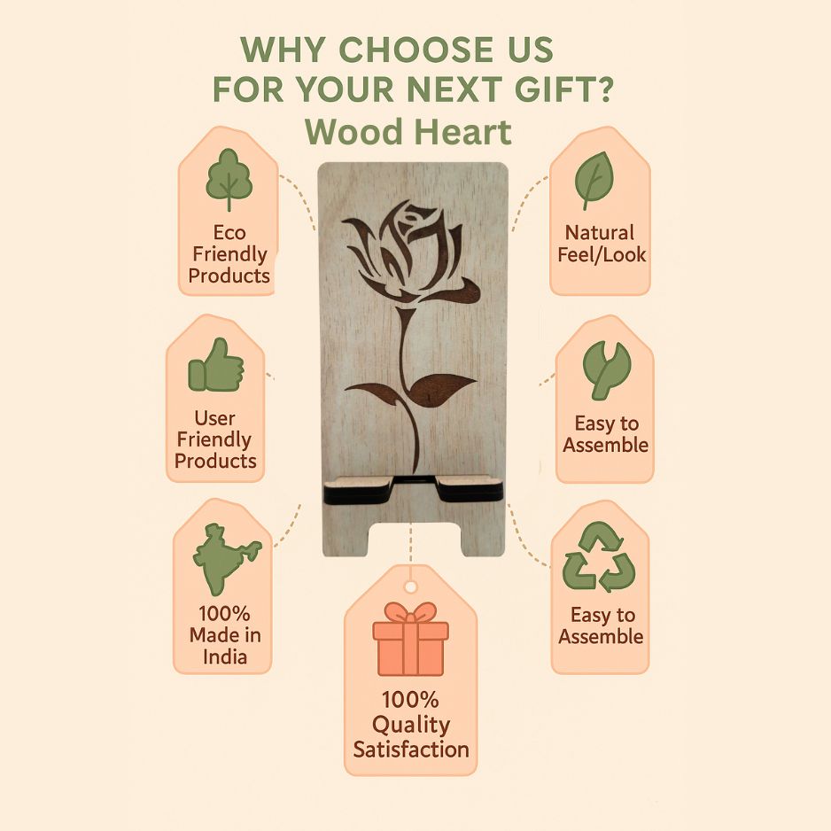 Add a touch of elegance and charm to your workspace with this Rose-Themed Customized Wooden Mobile Stand. Laser engraved with a beautiful blooming rose, this handcrafted piece represents love, beauty, and simplicity — making it a perfect companion for your desk or a thoughtful gift for someone special.