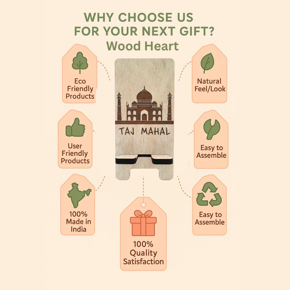 Bring nature to your desk with our Taj mahel Design Wooden Mobile Stand, beautifully crafted from premium MDF wood and precision laser engraved with a detailed tree pattern. A symbol of growth, stability, and life, this stand adds a touch of calm and eco-consciousness to any workspace.