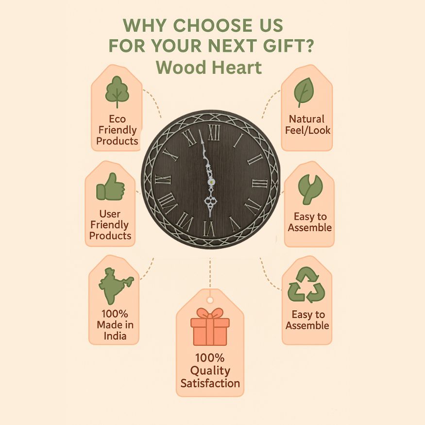 Add timeless charm to your décor with this beautifully crafted Wooden Wall Clock by Wood Heart. Designed with intricate Roman numerals and classic hour & minute hands, this clock blends traditional aesthetics with modern elegance. Made from premium-quality wood, its dark finish and carved border detailing make it a standout piece for living rooms, offices, or bedrooms. A perfect choice for gifting or enhancing your interior with a sophisticated touch. Proudly Made in India for lasting durability and style.