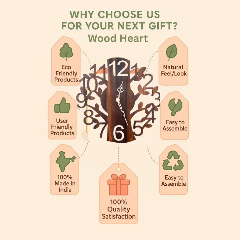 Elevate your home décor with this beautifully crafted Tree Shape Wooden Wall Clock from Wood Heart. Designed with precision and elegance, this clock features intricately carved numbers and branches, blending art with functionality. A perfect choice for living rooms, offices, or as a thoughtful gift.