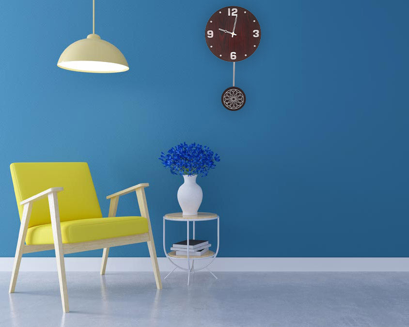 Upgrade your home décor with this elegant wooden wall clock from Wood Heart. Featuring a sleek round dial with bold white numerals and a beautifully crafted designer pendulum, this clock is a perfect blend of modern style and classic charm. Ideal for living rooms, offices, or gift occasions, it adds a touch of sophistication to any space. Proudly made in India with premium craftsmanship.