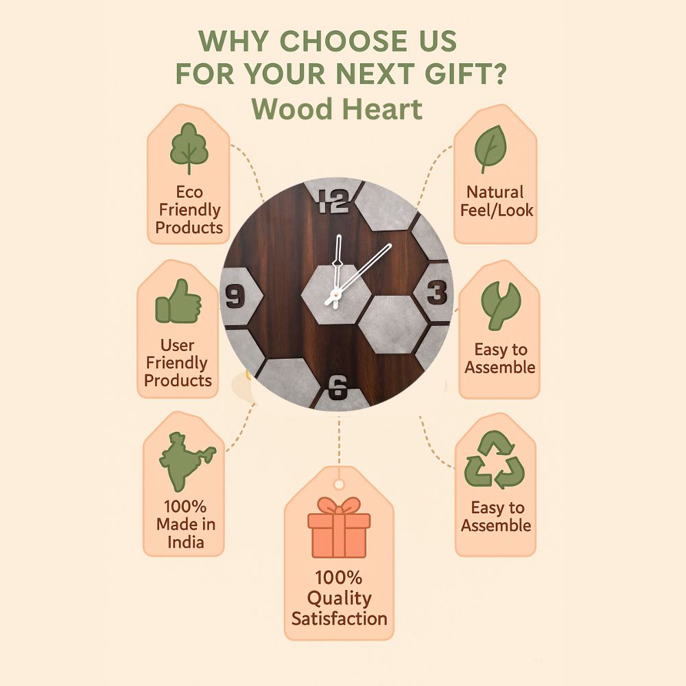 Give your space a bold and modern touch with this Hexagon Pattern Designer Wall Clock from Wood Heart. Crafted with a stunning combination of wood texture and concrete-style design, this clock blends elegance and contemporary style, perfect for any home or office setting.