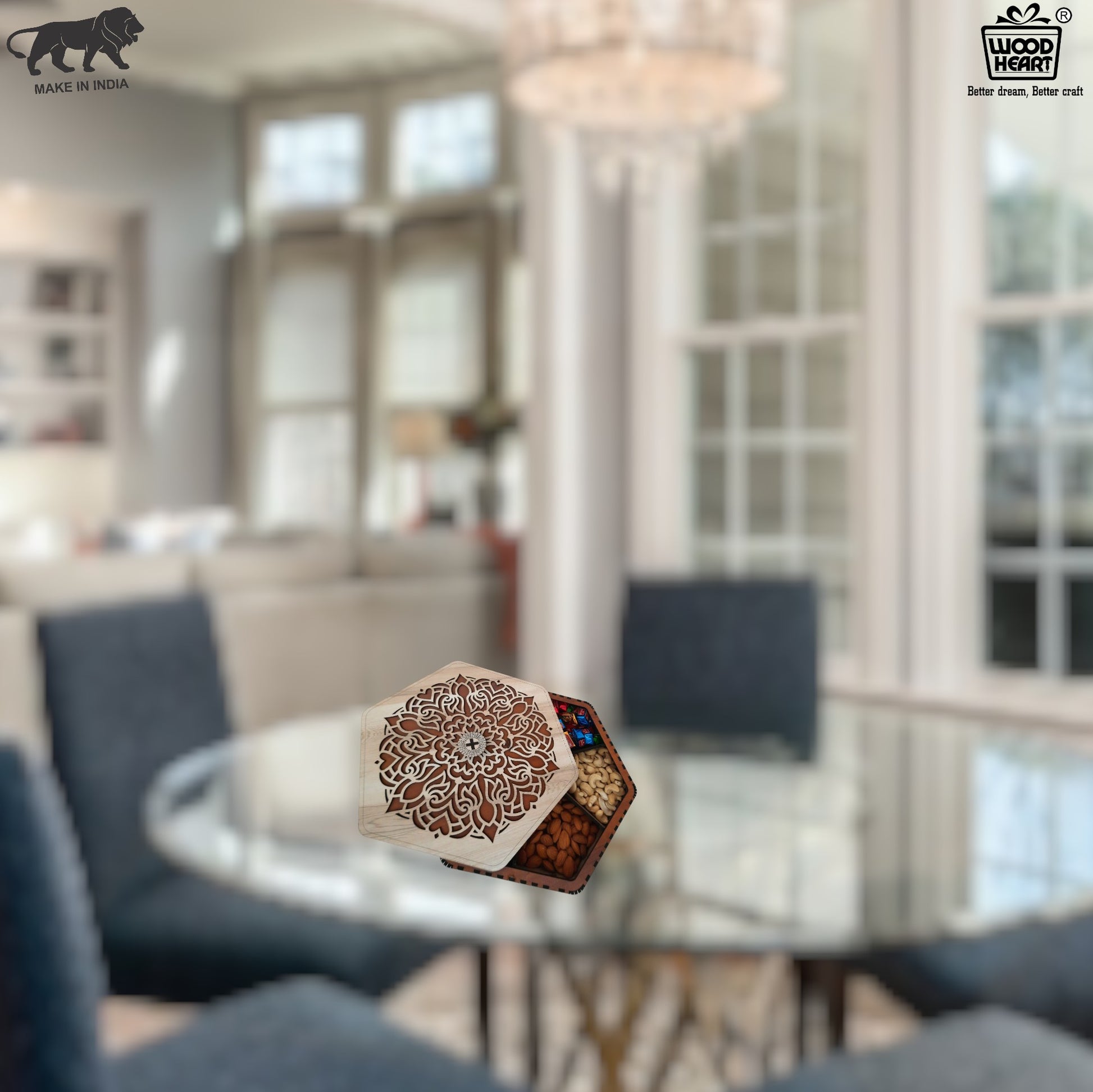 Add a touch of elegance to your gifting with this hexagon-shaped wooden dry fruit box. Adorned with an intricately laser-cut mandala design on the lid, this box opens to reveal multiple compartments filled with dry fruits and chocolates. Ideal for festive gifting, corporate hampers, and wedding favors, this artistic storage box combines luxury with tradition.