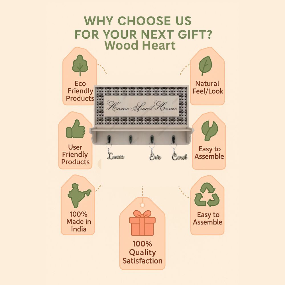 Add warmth and charm to your entryway with the Home Sweet Home Designer Key Holder. Crafted in an elegant beige wood finish with a finely detailed geometric pattern, this key holder blends modern design with homely sentiment. The text "Home Sweet Home" adds a welcoming touch, while the bottom shelf and hooks ensure practical functionality. Ideal for organizing keys and small essentials in style.