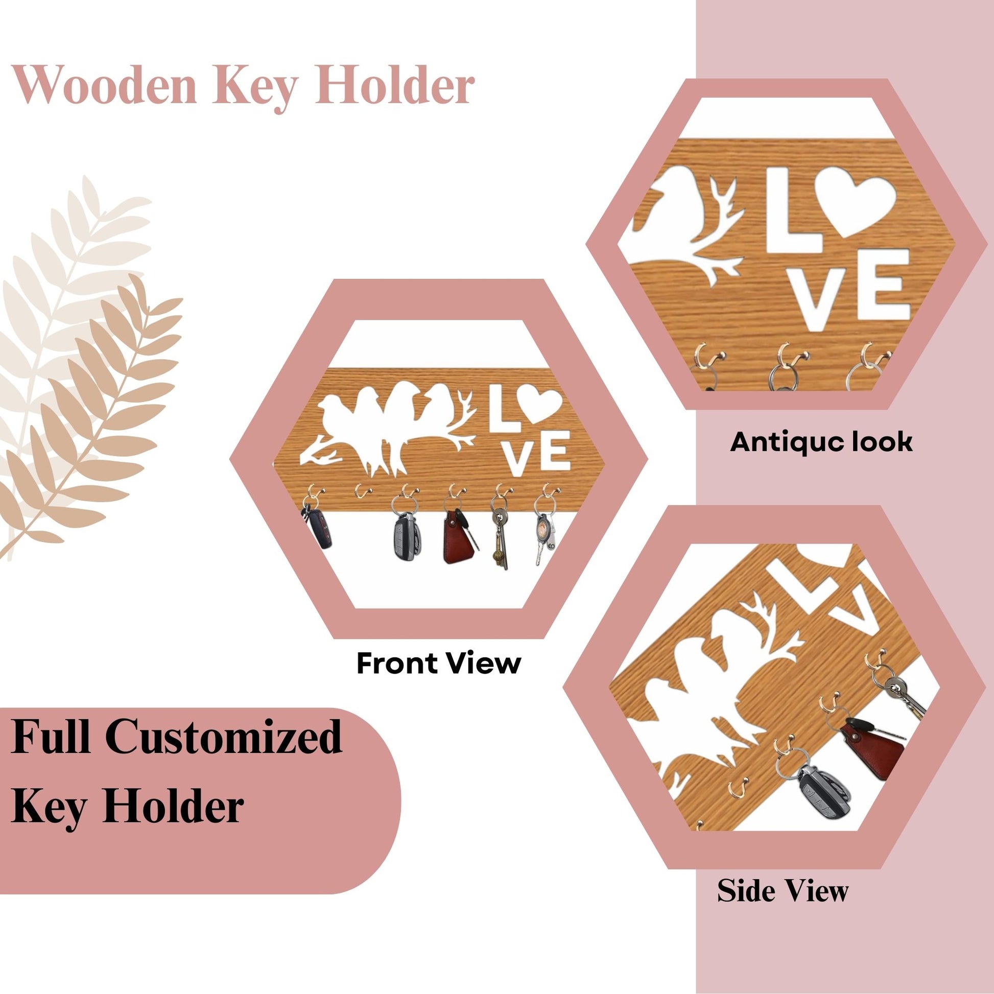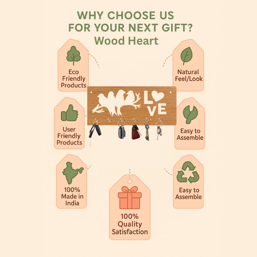 Celebrate love and togetherness with the charming LoveBirds Wooden Wall Key Holder. Featuring a silhouette of three birds perched on a branch and a playful “LOVE” design with a heart replacing the "O", this wall-mounted key organizer brings warmth and elegance to any home. Perfect for entryways, bedrooms, or living spaces, it keeps your keys secure while enhancing your décor.