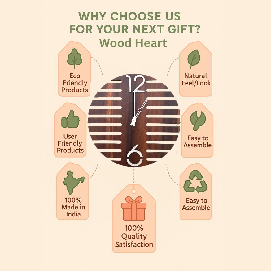 Add a touch of modern artistry to your space with this beautifully crafted layered wooden wall clock from Wood Heart. Designed with a unique overlapping square pattern on a round base, this timepiece blends simplicity with creativity. Its soft wood tones and minimal time markers make it ideal for Scandinavian, boho, or minimal-style interiors. A perfect blend of décor and utility for those who love understated elegance.