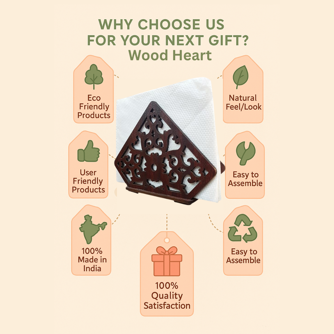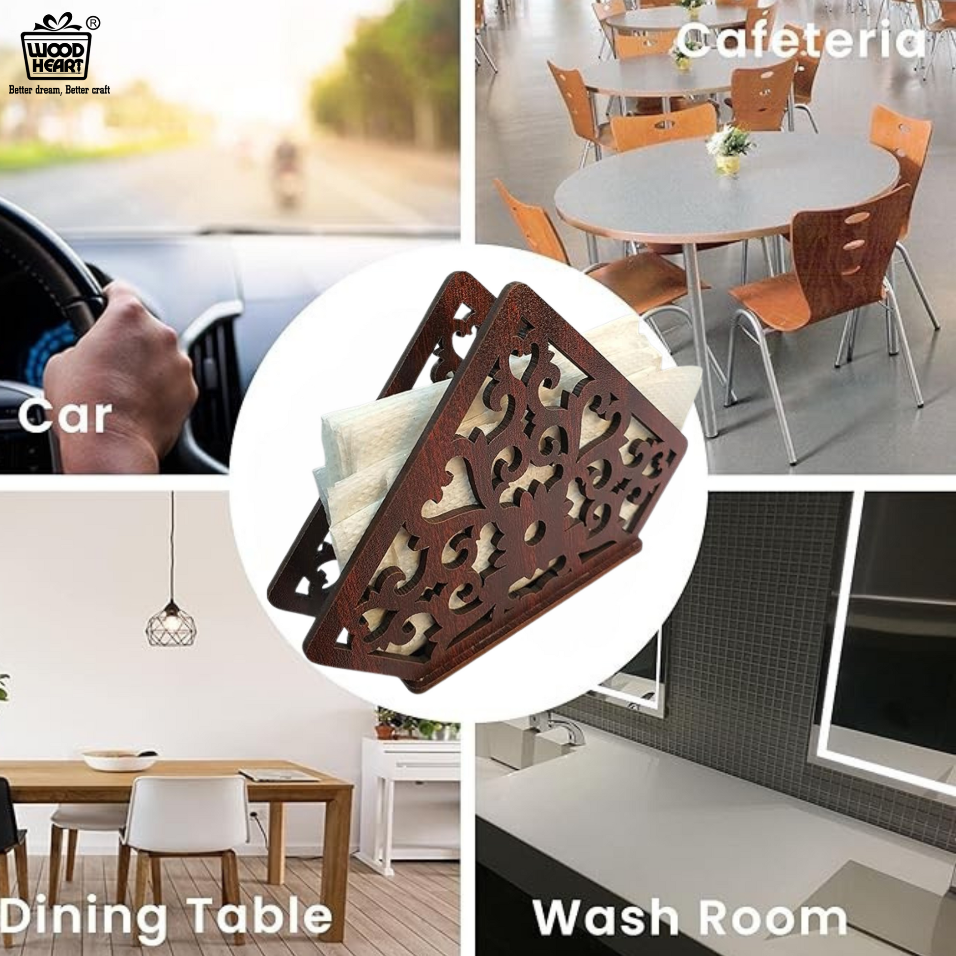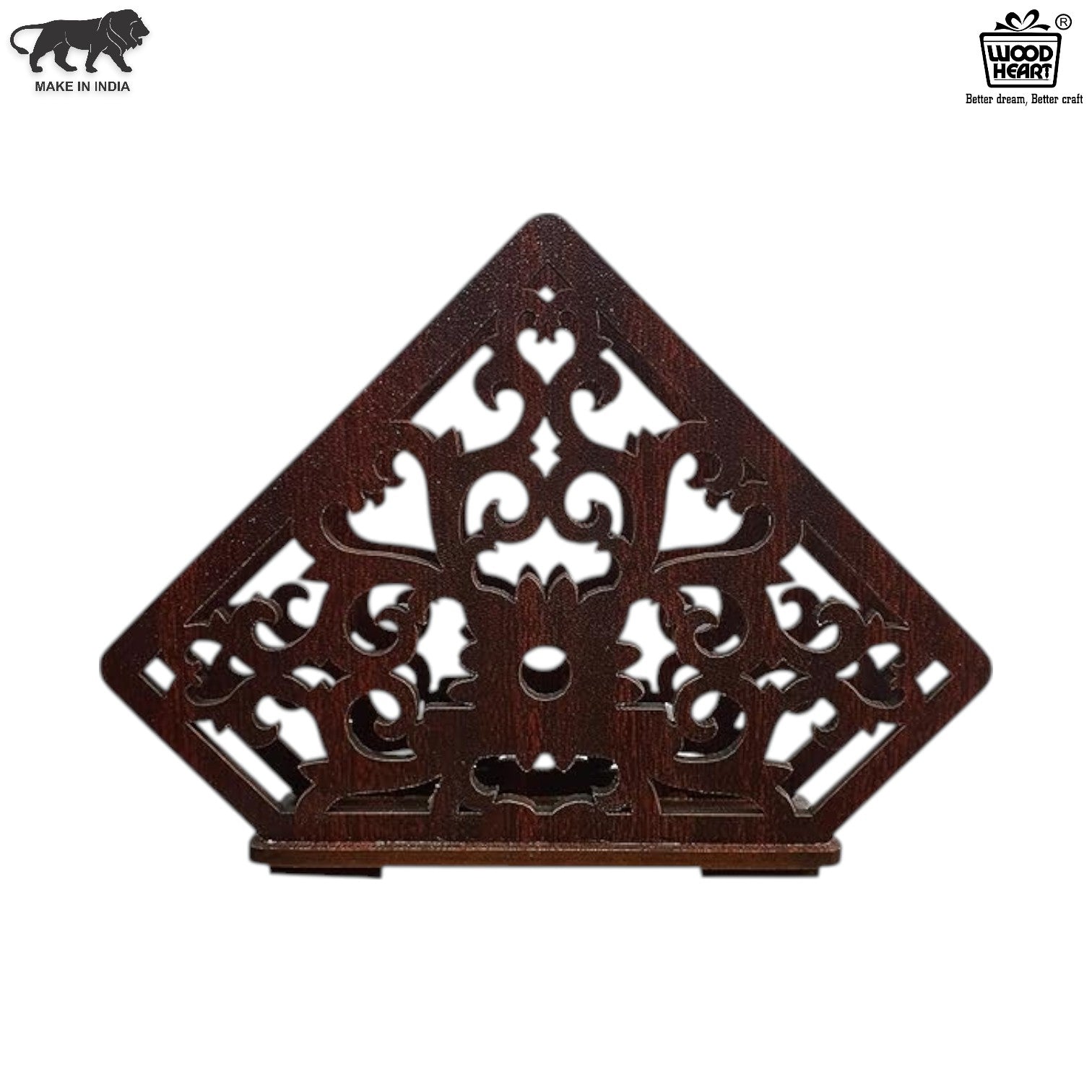 An elegant diamond-shaped napkin holder with intricate floral and vine cutwork, crafted to bring sophistication to your table setting. The rich wooden finish and detailed carving make it a perfect blend of traditional craftsmanship and modern utility. Ideal for dining tables, coffee tables, or restaurant décor, this holder keeps napkins neatly in place while adding a decorative touch.