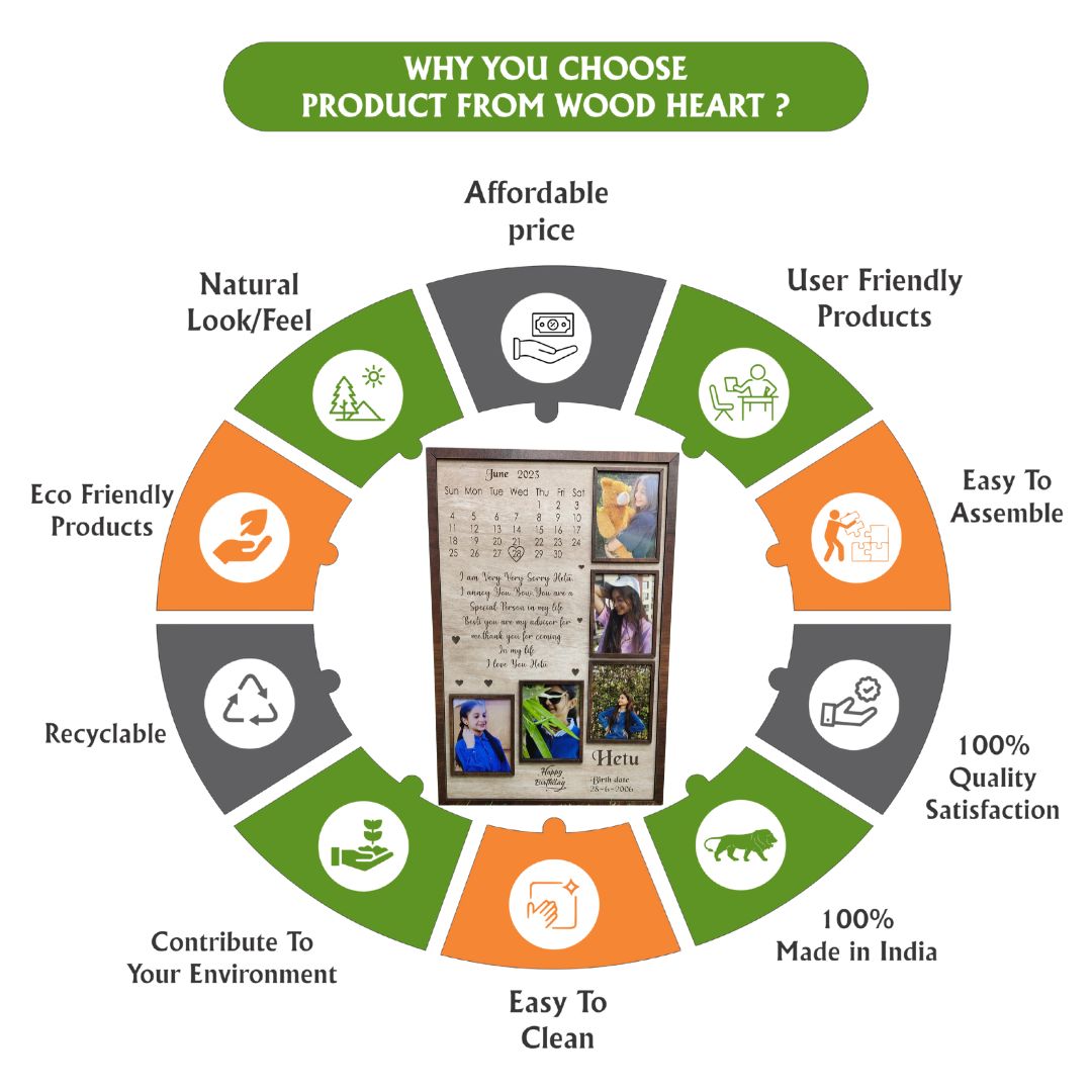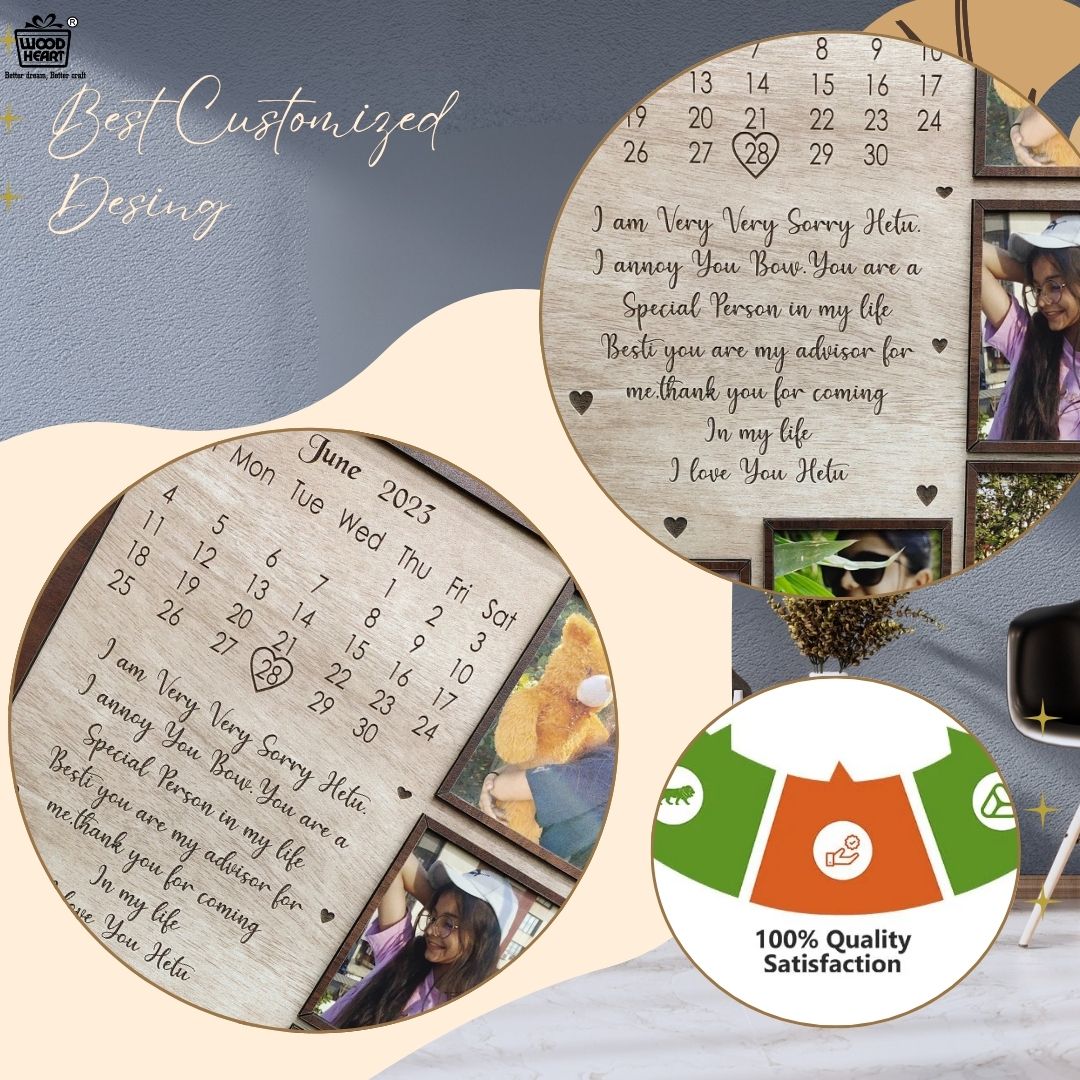 Celebrate precious memories with this Personalized Wooden Birthday Calendar Photo Frame, beautifully designed to showcase your special dates and photos. Crafted with precision, this frame features an engraved calendar highlighting a memorable date along with heartfelt messages and multiple photo slots to capture your favorite moments. Perfect for birthdays, anniversaries, or as a thoughtful “sorry” or appreciation gift, this elegant wooden piece adds a warm, personal touch to any space.