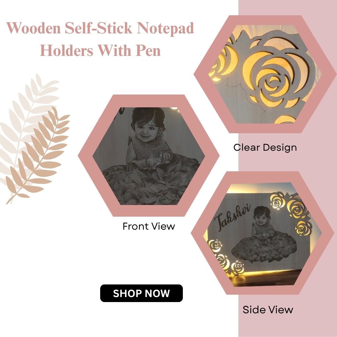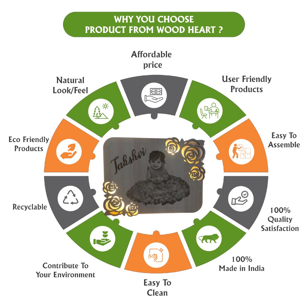Celebrate your precious memories with this Personalized Wooden LED Photo Frame with Floral Design from Wood Heart. Beautifully crafted from premium wood, this frame features an elegant floral cut-out pattern illuminated with warm LED lighting. Perfect for showcasing a baby photo, couple portrait, or family picture, it adds a soft, cozy glow to any room. The engraved name customization makes it a truly personal keepsake and a thoughtful gift for birthdays, anniversaries, or baby showers.