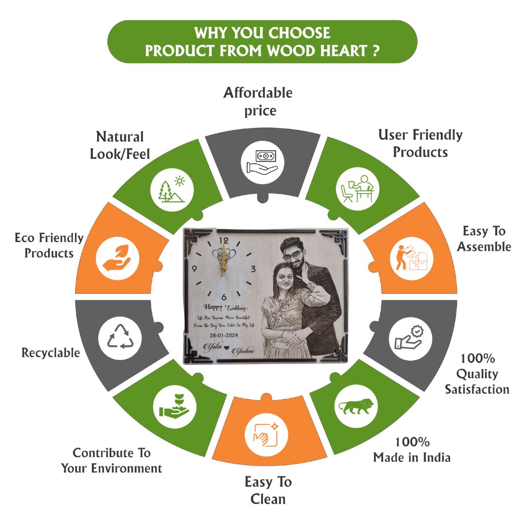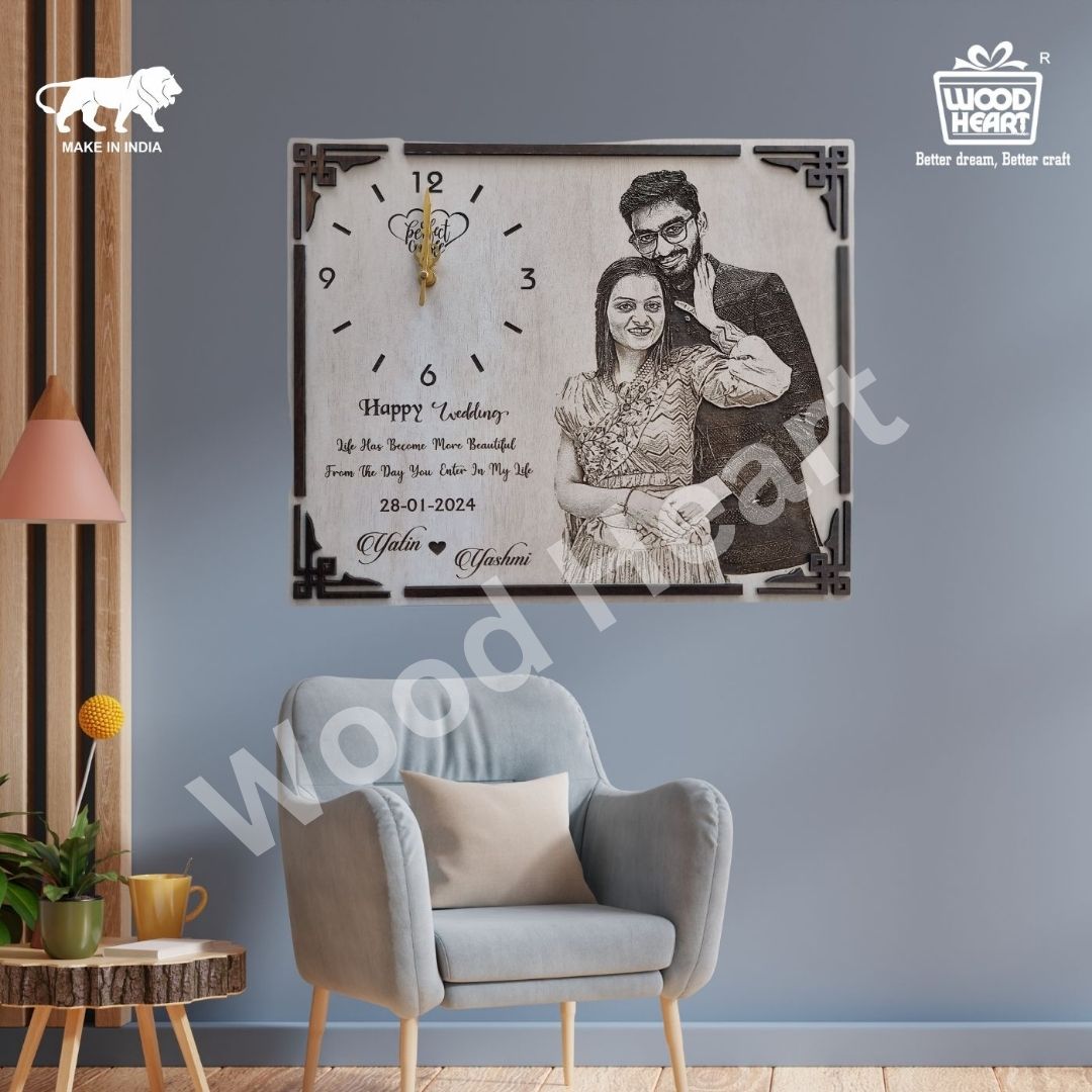 Celebrate timeless love with this Personalized Wooden Photo Frame with Clock by Wood Heart. Beautifully engraved with your favorite photo, names, and a special date, this piece blends art with functionality. The elegant clock adds a meaningful touch, symbolizing cherished moments that stand the test of time. Perfect for weddings, anniversaries, or couple gifts โ itโs a heartfelt keepsake that captures memories forever.