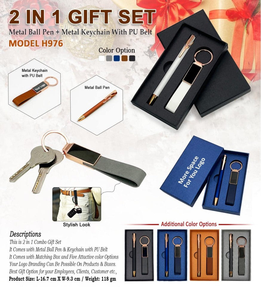 This elegant combo gift set includes a stylish metal ball pen and a premium metal keychain with a PU belt. Presented in a matching box, it’s an ideal corporate gift with excellent branding potential.