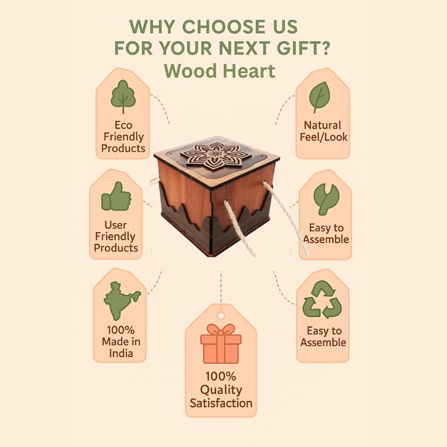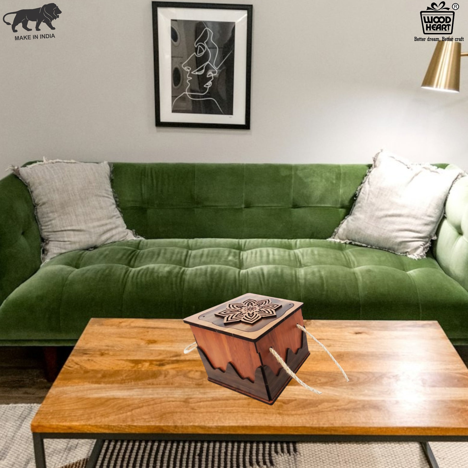 This premium wooden gift box is a beautiful blend of tradition and elegance, perfect for festive or corporate gifting. Crafted in a cube-shaped design, it features a laser-cut floral emblem on the lid and sturdy rope handles on both sides for easy carrying. Ideal for dry fruits, chocolates, or as a luxury gift hamper box.