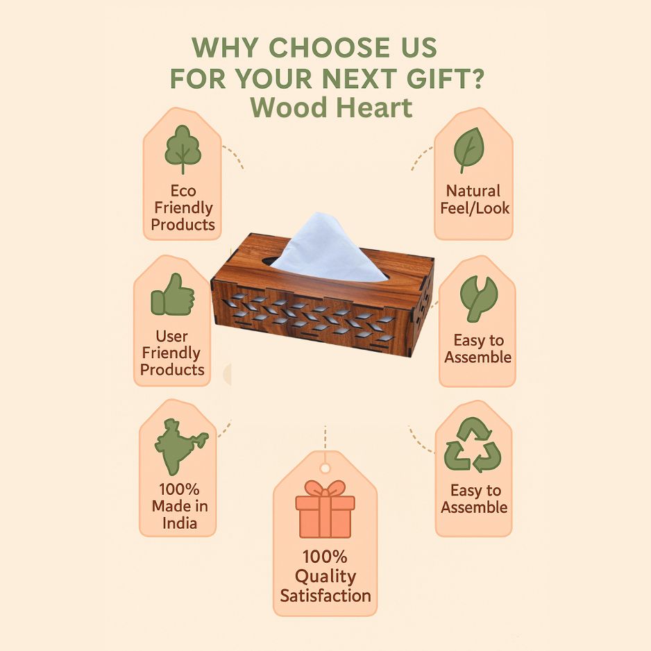 Add a touch of sophistication to your space with this handcrafted rectangular wooden tissue box holder. Featuring elegant leaf-pattern cutouts on the sides, it combines style with utility, keeping tissues neatly stored while enhancing the look of your dining table, coffee table, office desk, or car dashboard. Its polished finish and sturdy build make it both functional and decorative.