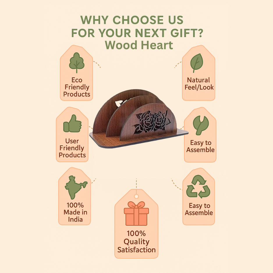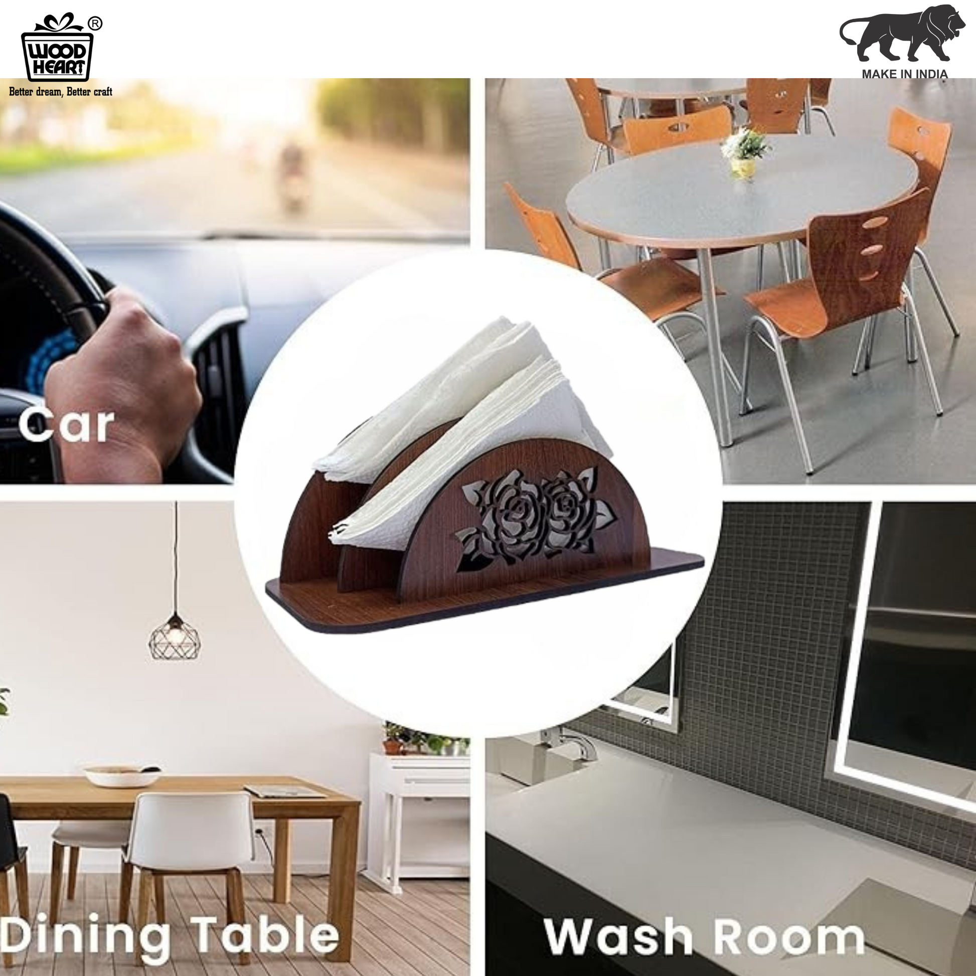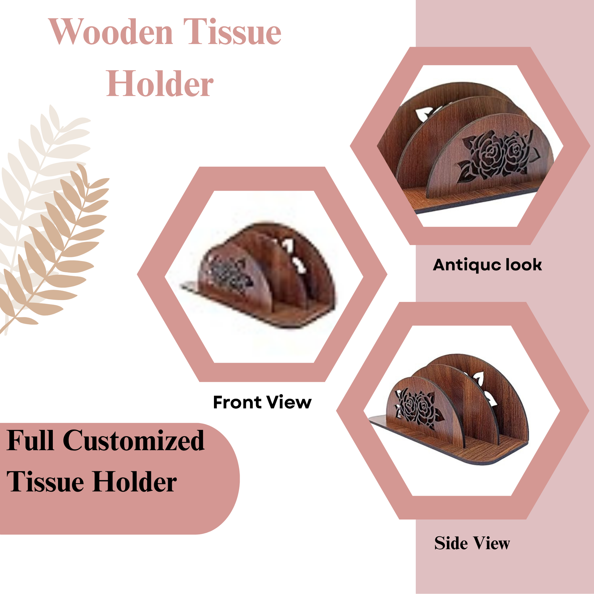 A stylish and functional wooden napkin holder adorned with an elegant rose cutwork design. Perfect for keeping napkins neatly arranged and within easy reach, this handcrafted piece enhances both modern and traditional table setups. Its sturdy structure and timeless floral motif make it a charming addition to dining tables, coffee tables, or office spaces.