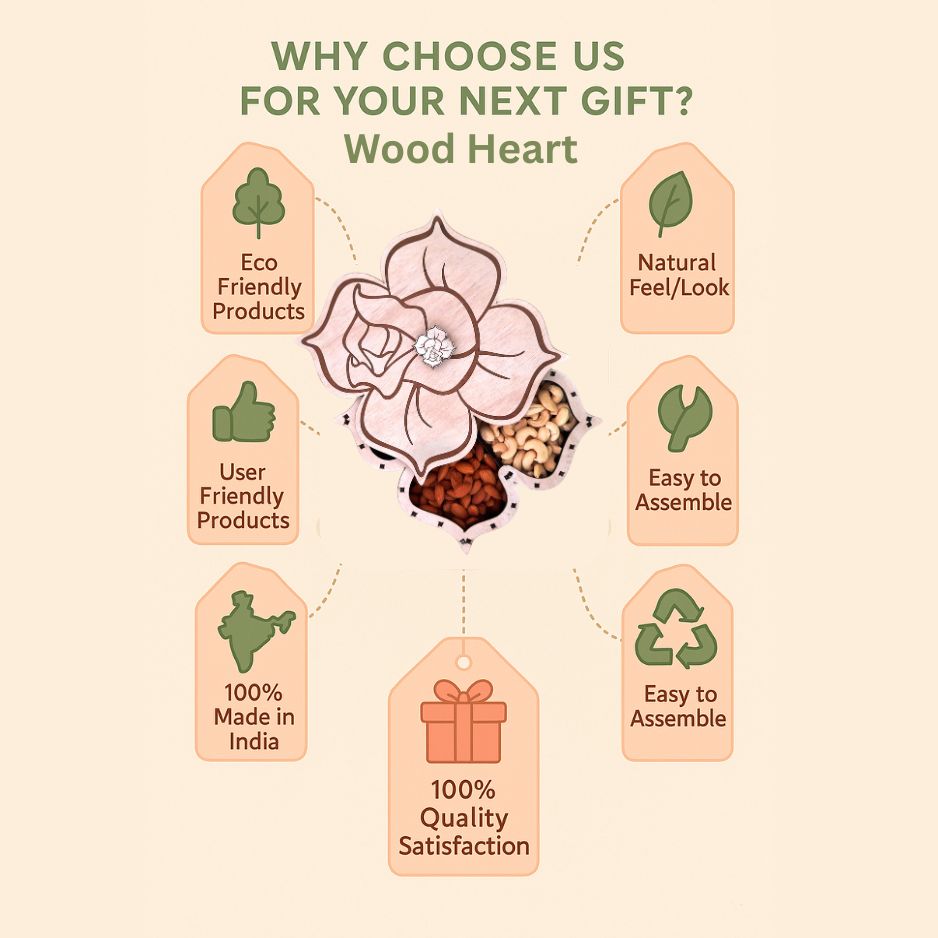 Delicate, elegant, and truly unique – this rose-shaped wooden dry fruit box is a piece of functional art. Featuring a beautifully carved rose lid with a floral knob, it opens to reveal petal-inspired compartments filled with dry fruits like almonds and cashews. A perfect gift that speaks of love, tradition, and craftsmanship – ideal for weddings, Diwali, and special celebrations