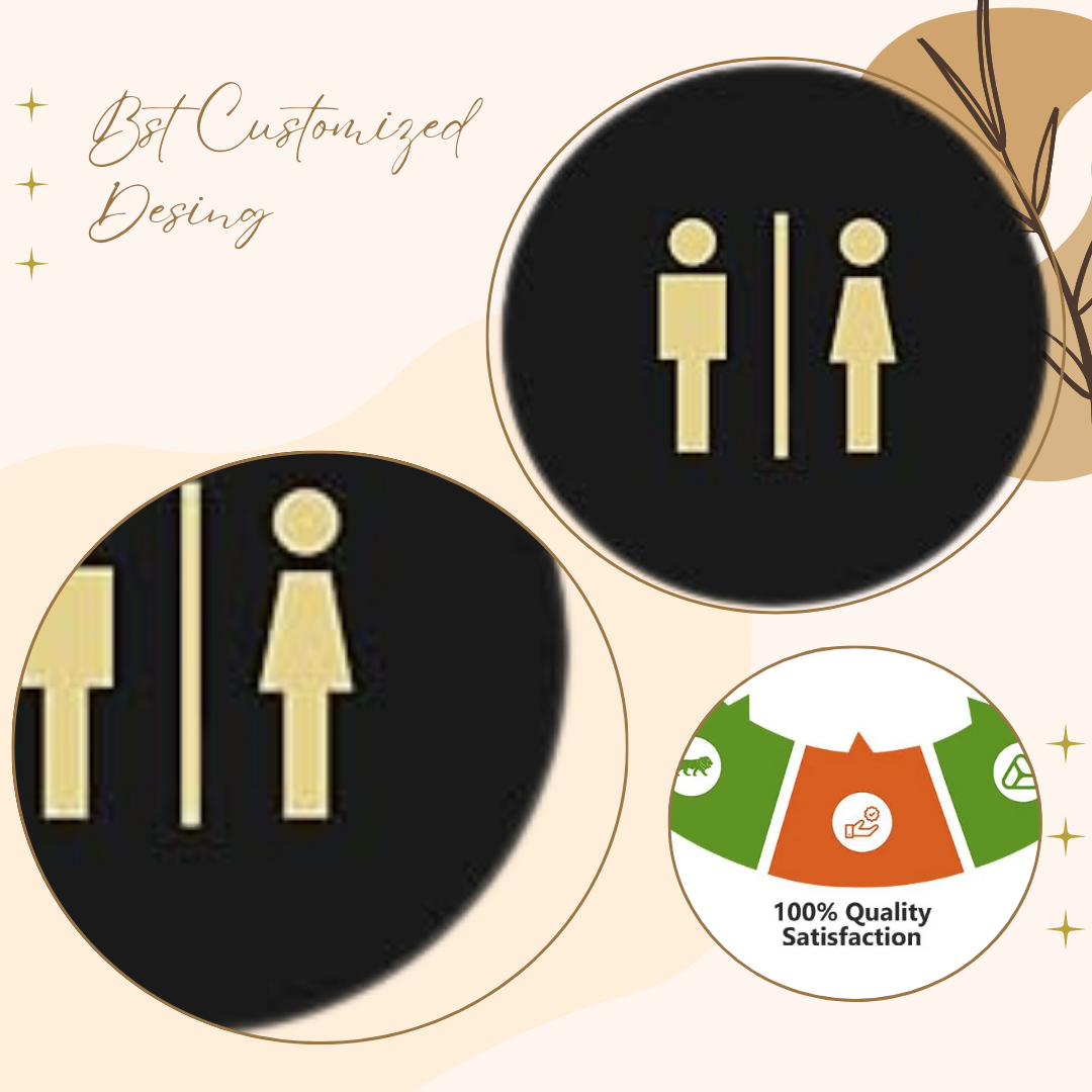 A sleek, modern round washroom sign featuring gold male and female symbols on a black background, separated by a vertical line for clear identification. Designed to blend style with functionality, it is perfect for offices, hotels, cafes, and public facilities, ensuring visitors can easily locate restrooms.