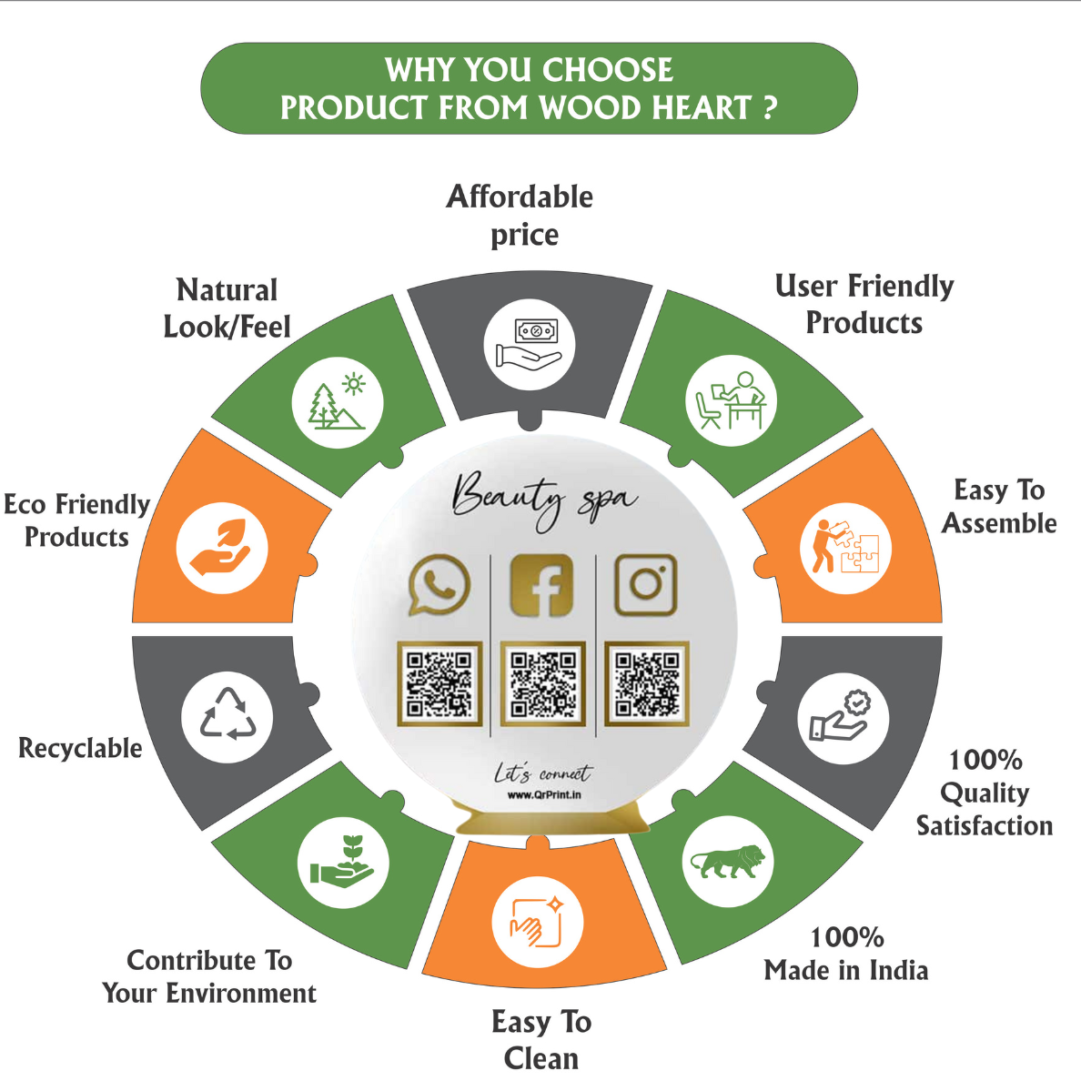 A sleek, modern round acrylic QR code stand designed for beauty spas, salons, and wellness centers to make client connections effortless. Featuring gold-accented icons for WhatsApp, Facebook, and Instagram, along with corresponding QR codes, this display lets customers instantly connect with your business online. With a clean white background and elegant typography, it enhances your counter’s aesthetic while promoting your brand.