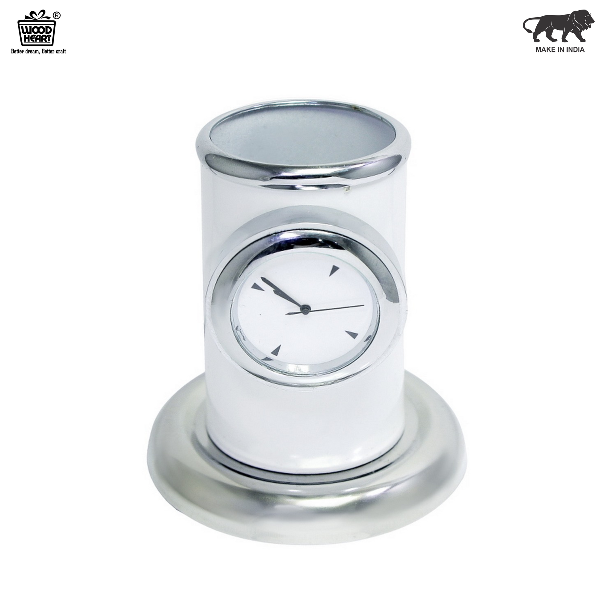 Stay organized in style with this sleek white cylindrical pen holder, featuring an elegant analog clock at the front. Combining functionality and aesthetics, it's a perfect addition to any professional desk or study table. Ideal for personal use, gifting, or corporate promotions.
