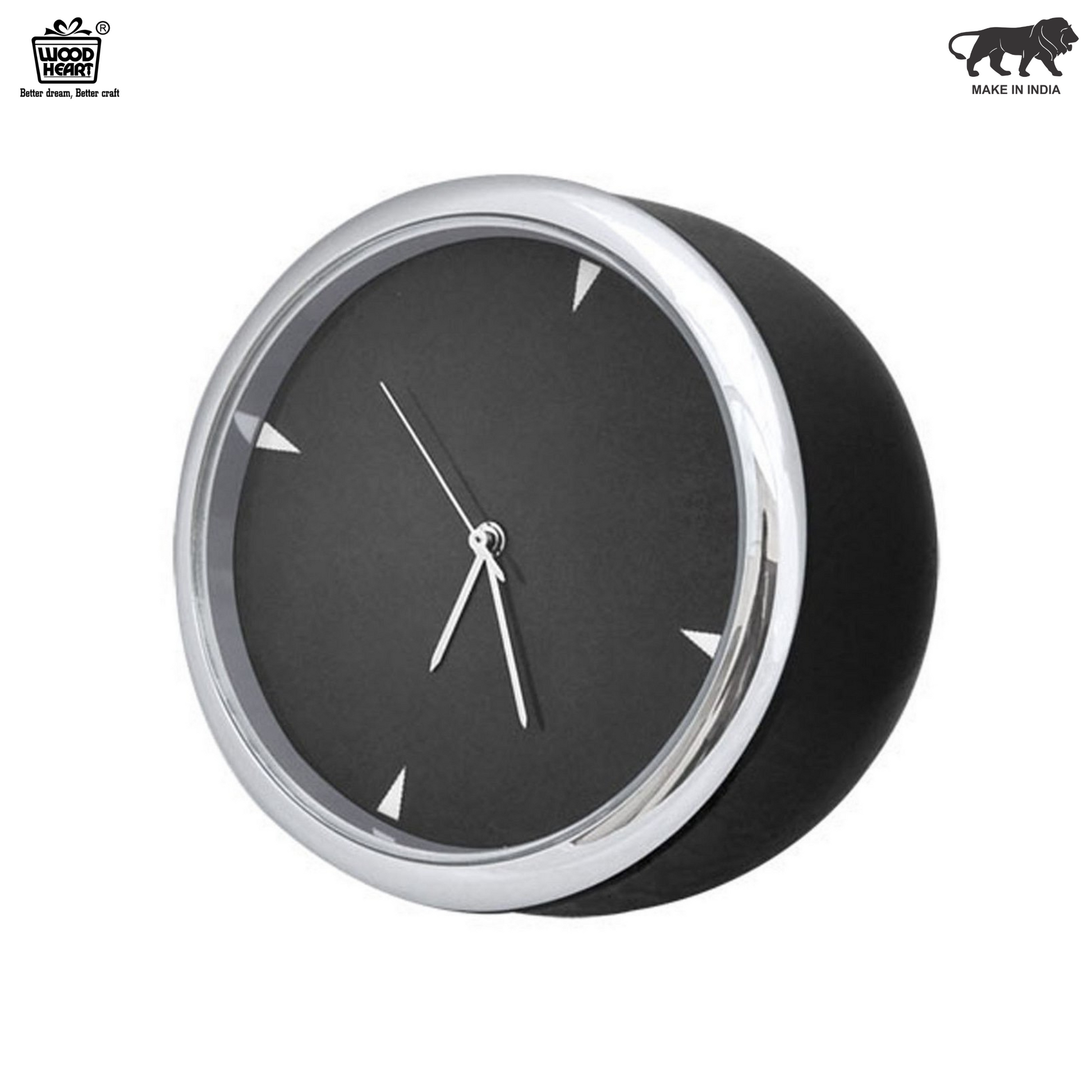 This stylish and compact mini desk clock from Wood Heart combines modern minimalism with classic functionality. Its deep black body, matched with a sleek chrome-finished rim, makes it a striking accent for any workspace or room.