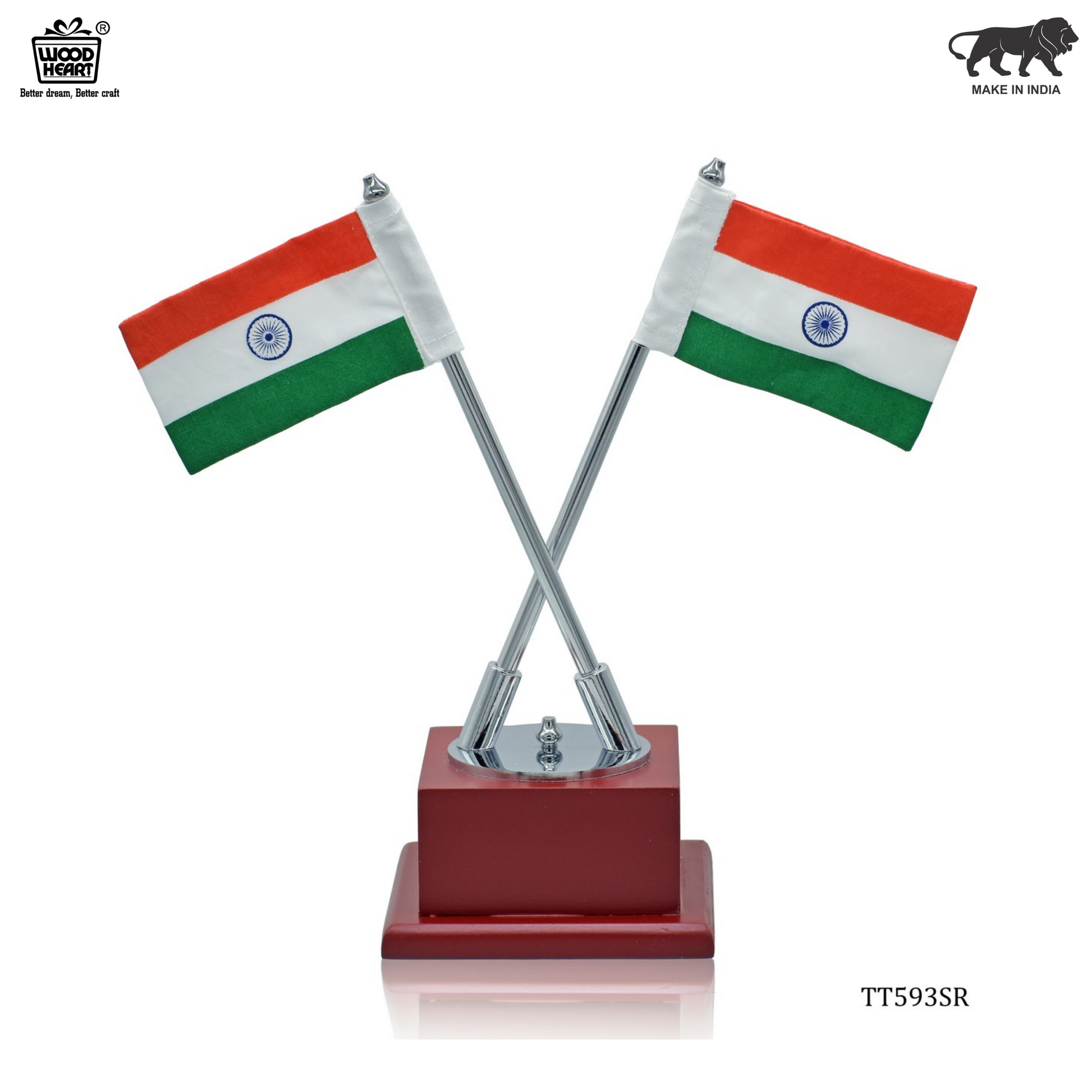 Showcase your patriotic spirit with elegance through the WoodHeart® Twin Indian Flag Table Decor. Designed with sleek chrome-plated poles and a rich wooden base, this piece brings charm and national pride to your workspace, home, or gifting collection.