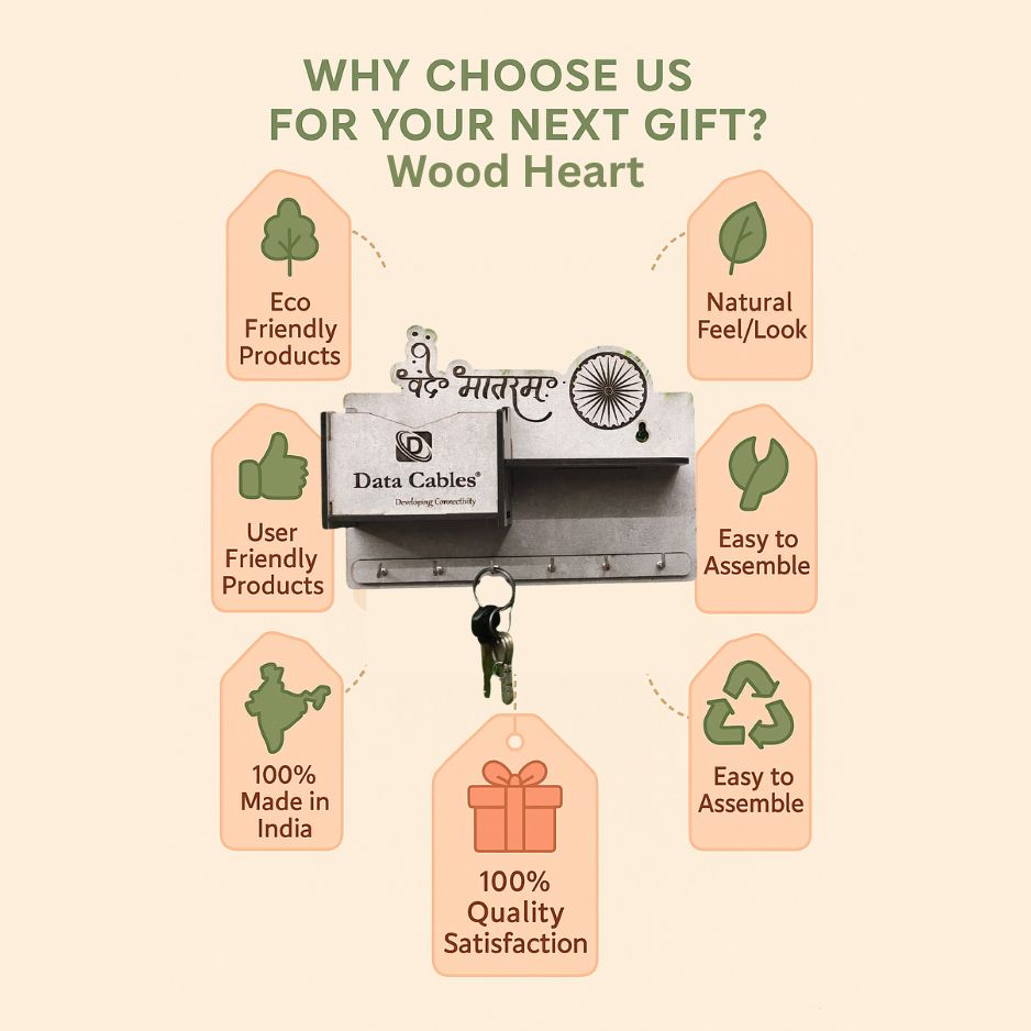 Celebrate the spirit of India while keeping your space neat with the "Vande Mataram" Wall Mounted Organizer & Key Holder. Featuring a laser-engraved Ashoka Chakra and the words "वन्दे मातरम्", this uniquely crafted piece is perfect for home or office entrances. With key hooks, a shelf, and a branded document pocket, it’s a versatile, functional décor solution.