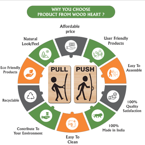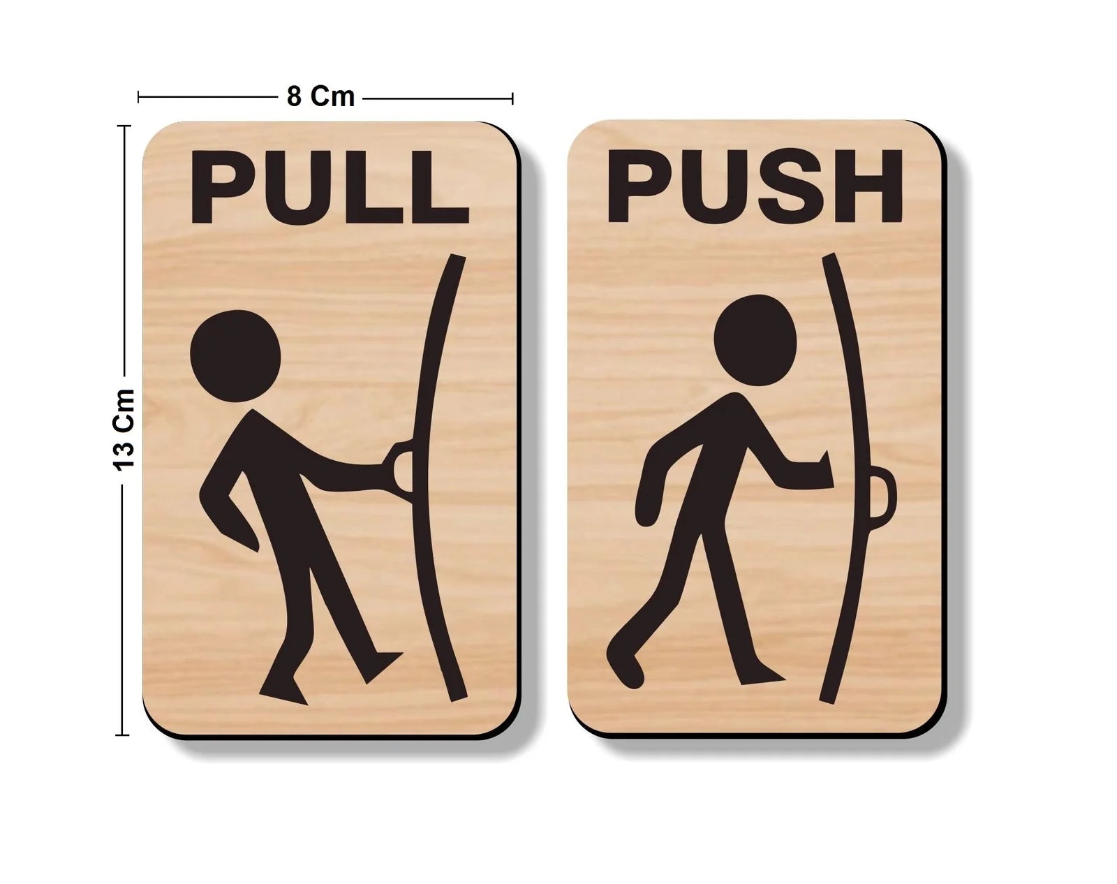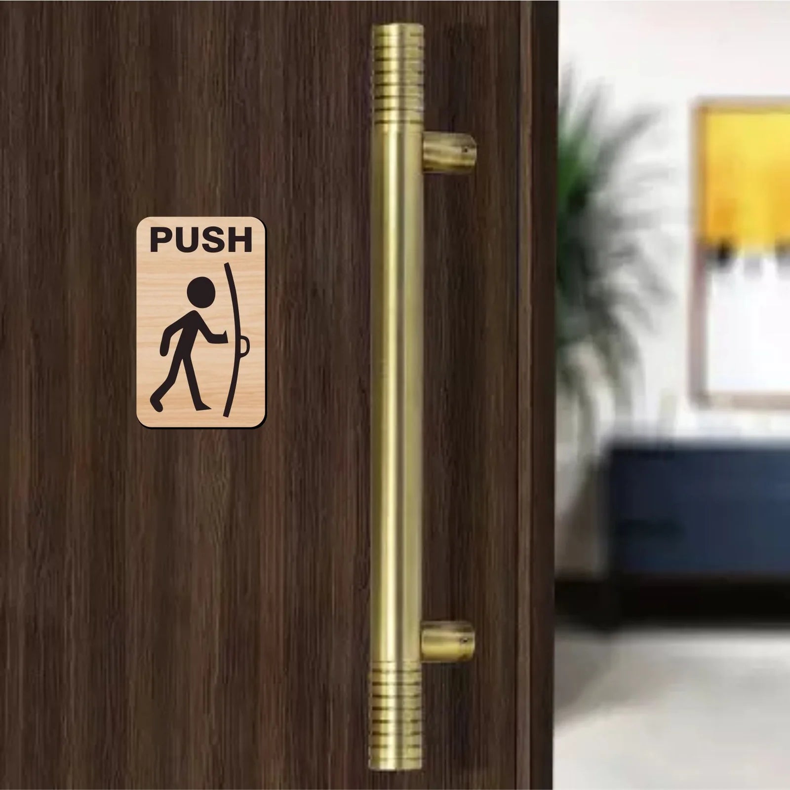 A sleek and modern set of door signs with a natural wood finish background, featuring black stick figure icons and bold text for “Push” and “Pull.” Designed for clear visibility and aesthetic appeal, these signs are perfect for offices, restaurants, cafes, hotels, and commercial spaces.