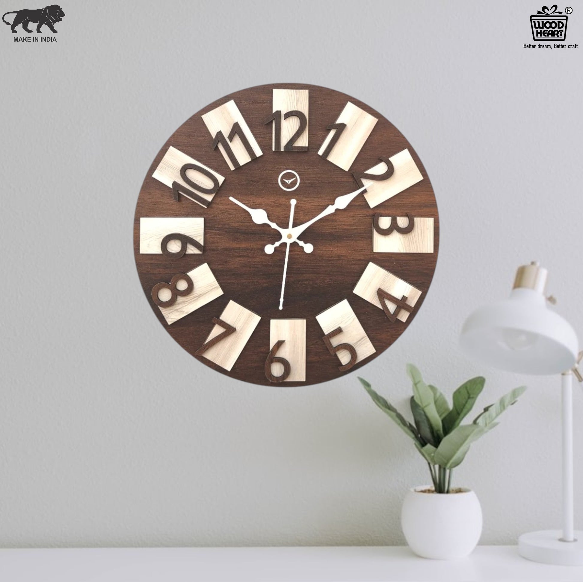 Elevate your interior décor with the Wood Heart Premium Block Number Wall Clock. Featuring bold 3D-style numbers set on contrasting wood-tone blocks, this timepiece blends contemporary design with rustic charm. The dark walnut base and light wood accents create a striking visual effect, making it an ideal piece for living rooms, hallways, or stylish workspaces.