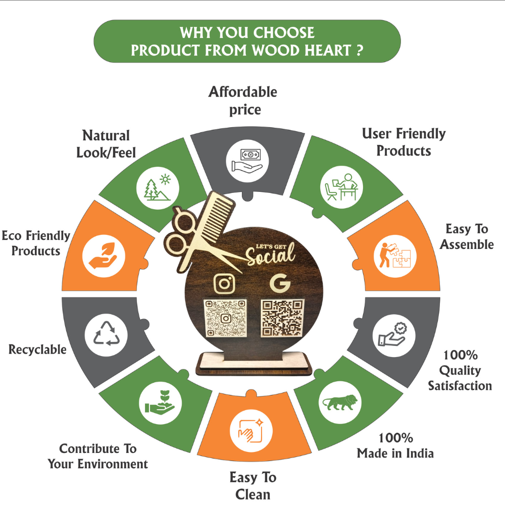 A stylish, salon-themed wooden display stand designed specifically for barber shops, hair salons, and grooming studios. Featuring a laser-engraved scissor and comb design along with two QR codes for Instagram and Google Reviews, this stand makes it easy for customers to connect with your brand online. Perfect for enhancing your shop’s décor while encouraging customer engagement and feedback.