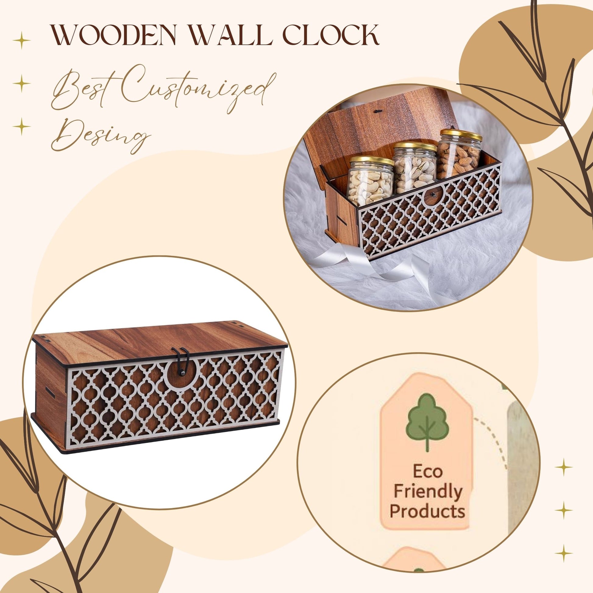 Elevate your kitchen or gifting presentation with this premium handcrafted wooden storage box. Featuring a long rectangular design and an elegant white laser-cut front panel, this box is ideal for storing spice jars, dry fruits, or as a utility/gift organizer. Its secure loop-lock and traditional pattern offer a blend of function and luxury.