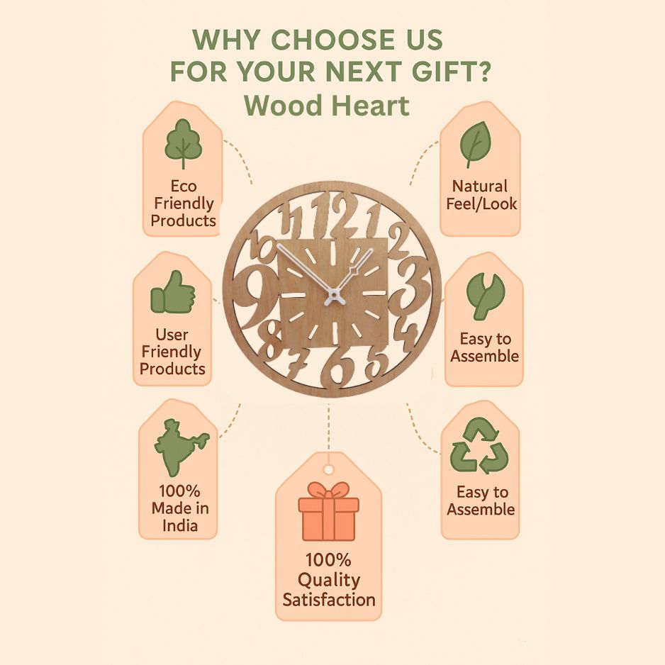 Add a modern artistic flair to your space with this stunning Wooden Designer Wall Clock featuring oversized cut-out numerals and a bold square inner dial. Crafted from premium quality MDF, this clock beautifully blends contemporary aesthetics with traditional functionality. The precise quartz movement ensures silent and accurate timekeeping, making it ideal for living rooms, offices, or creative workspaces.