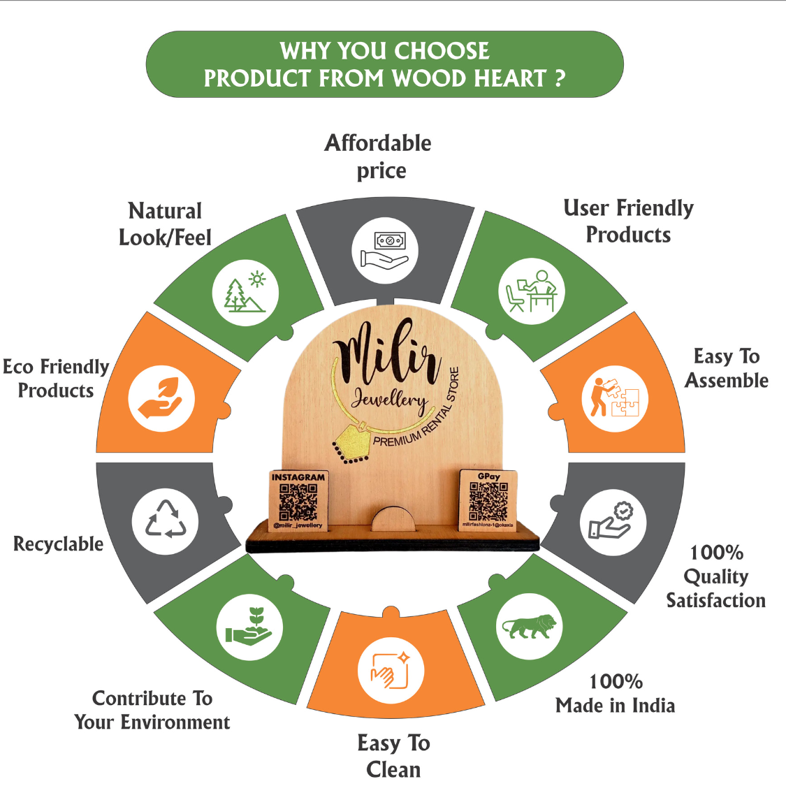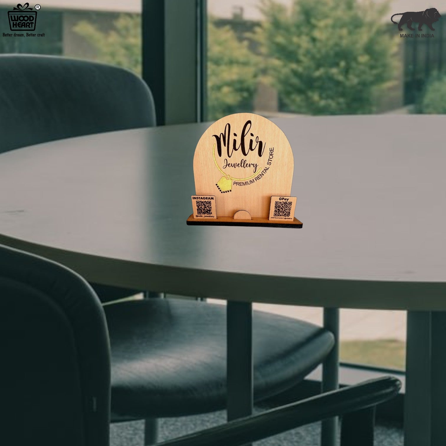 A beautifully crafted wooden display stand designed for premium jewellery rental stores, featuring dual QR codes for instant access to Instagram and GPay. With a stylish arched backdrop showcasing a gold-engraved jewellery motif and brand name, this stand combines functionality with elegance, making it a perfect addition to shop counters, exhibitions, and events.