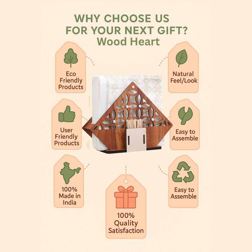 This handcrafted wooden napkin holder with an attached toothpick compartment combines elegance and utility in one compact design. The diamond-shaped frame features intricate geometric cutwork with delicate embellishments, making it a stylish addition to any dining table, café, or kitchen. Designed for both organization and presentation, it keeps napkins neatly in place while ensuring toothpicks are conveniently accessible.