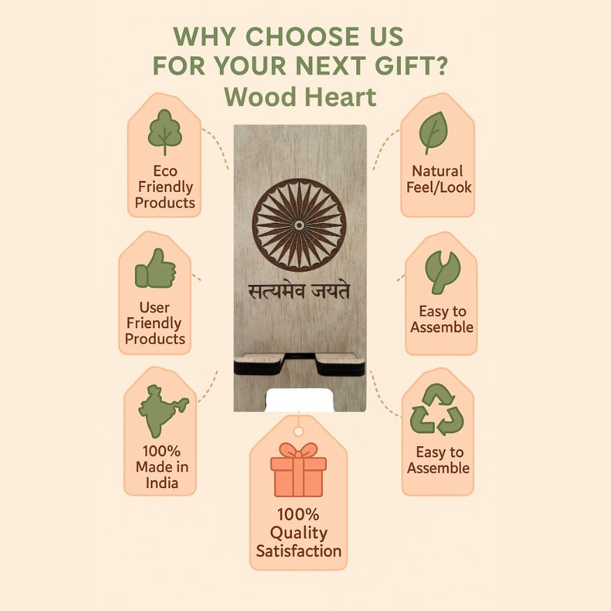 Showcase your patriotism with this beautifully crafted wooden mobile stand featuring the Ashoka Chakra and engraved "Satyamev Jayate" – the national motto of India. Made from high-quality MDF wood and laser-engraved with fine detail, this mobile holder adds an elegant and meaningful touch to your workspace. Ideal for desks, reception counters, and gifting during national events or patriotic celebrations.