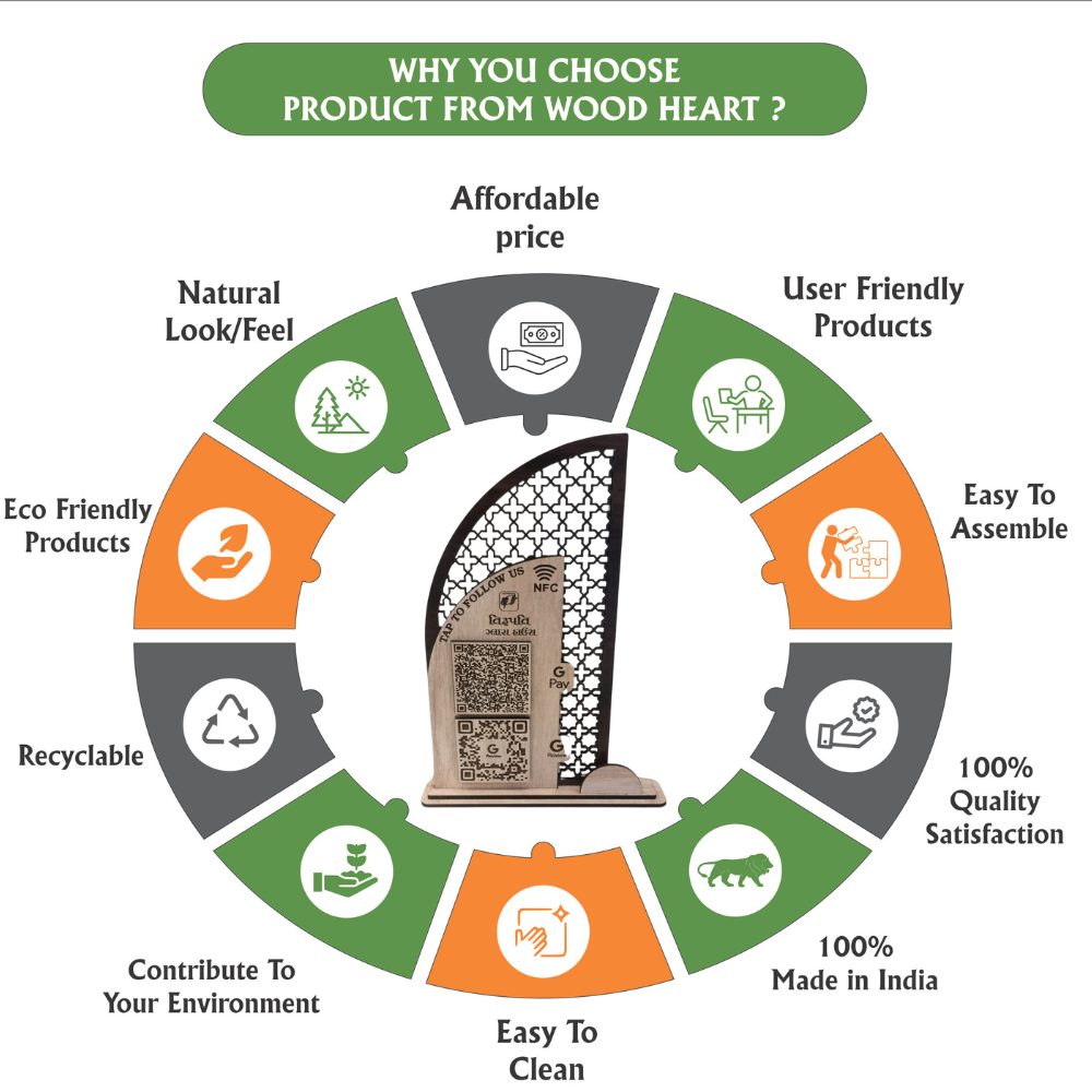 Upgrade your business counter with this premium Wooden NFC & QR Code Stand, designed for seamless digital interactions. Featuring precision laser-cut patterns and a modern half-arch design, it allows customers to instantly scan QR codes or tap for NFC-based payments, reviews, or social media links. Ideal for shops, cafés, offices, and events, it blends technology with elegant craftsmanship.