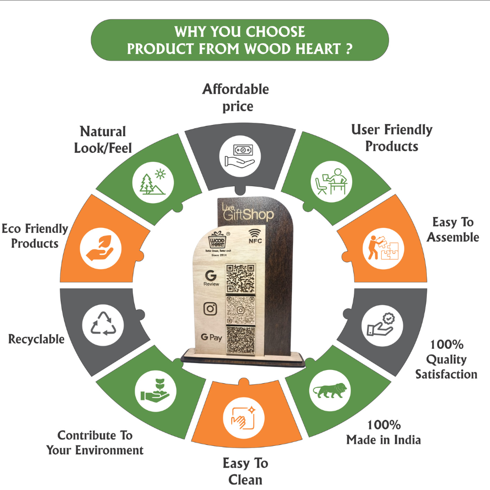 A premium handcrafted wooden display stand designed for modern retail stores, cafés, restaurants, and small businesses. It combines NFC technology and engraved QR codes to allow customers to easily connect with your Google Reviews, Instagram, and GPay payment link. Perfect for enhancing customer interaction and making digital engagement effortless while maintaining an elegant wooden aesthetic.