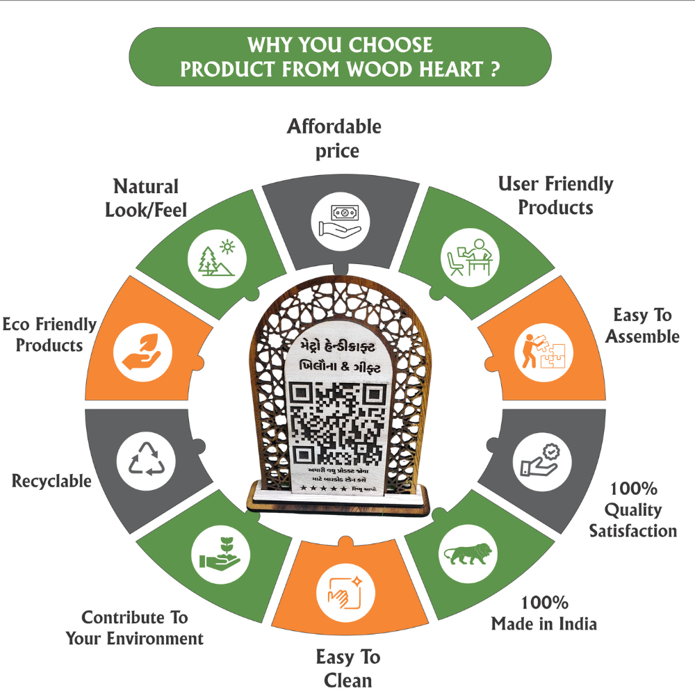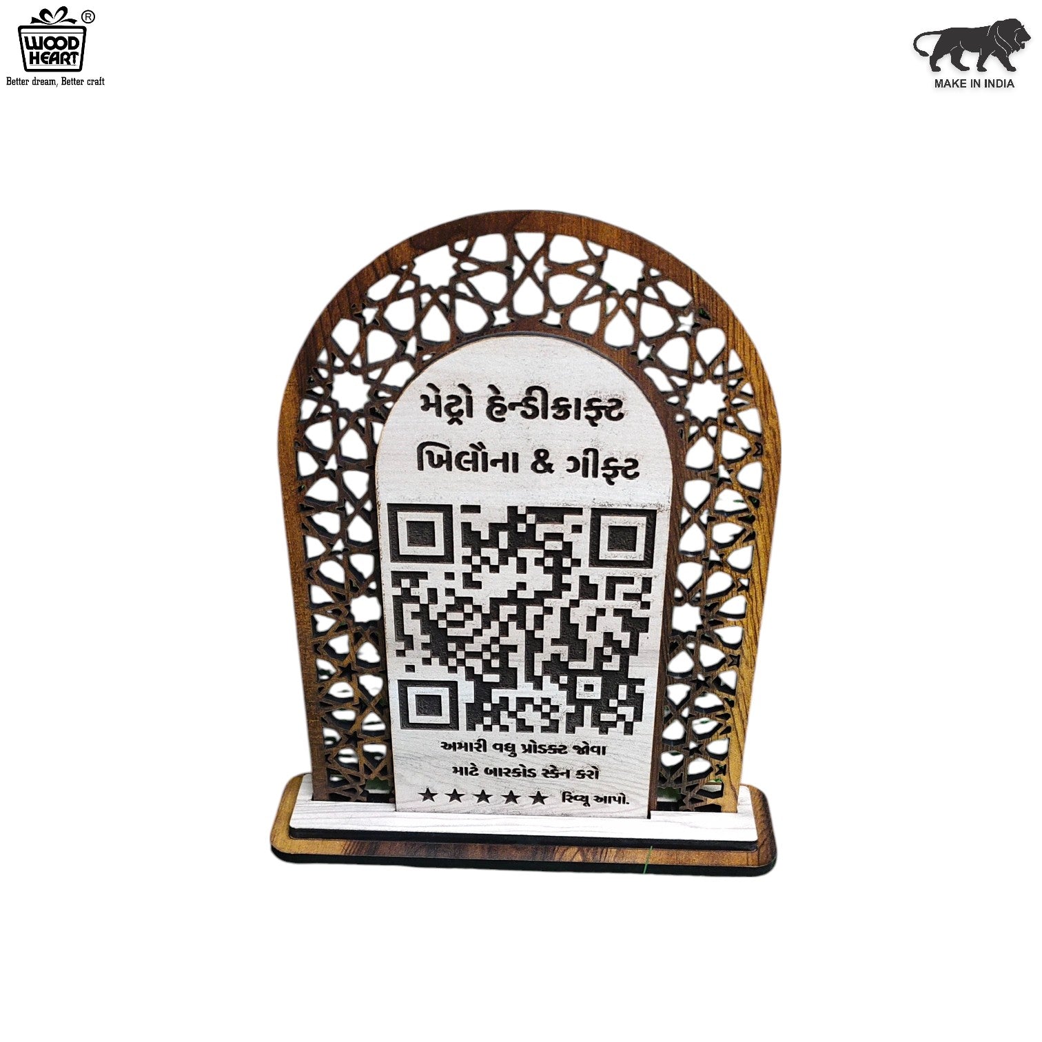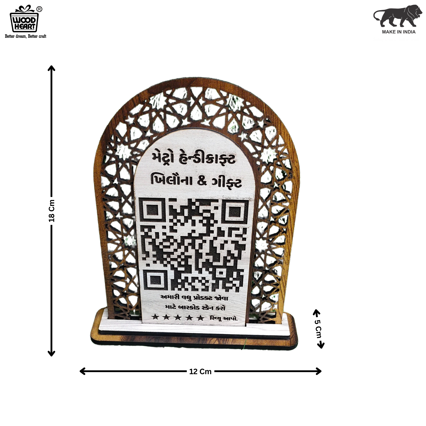 A beautifully handcrafted wooden QR code display stand with intricate lattice arch detailing, designed for local businesses, shops, and salons. The engraved Gujarati text personalizes the piece, making it perfect for regional branding and cultural connection. Featuring a prominently displayed QR code for easy scanning, this stand blends traditional craftsmanship with modern digital convenience.