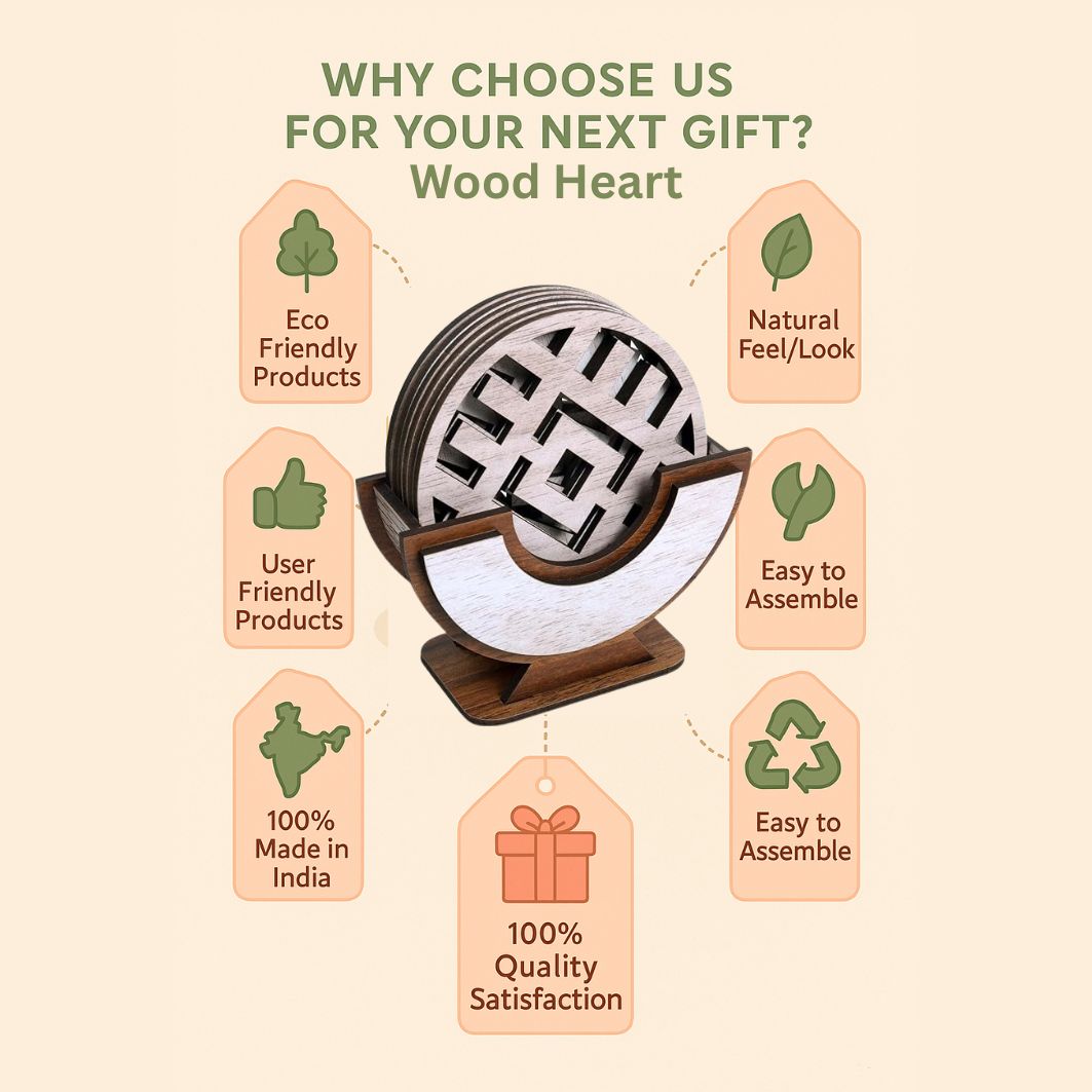 Enhance your table décor with this elegant round wooden coaster set, featuring intricate geometric cutwork for a stylish and artistic appeal. The coasters are finished with a rustic whitewashed texture, perfectly blending contemporary design with traditional craftsmanship. A matching semi-circular holder ensures the set stays organized and ready for use. Ideal for protecting your furniture from stains, heat, and scratches while adding a decorative touch.