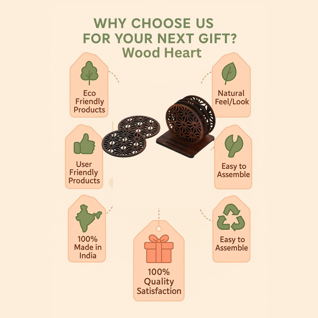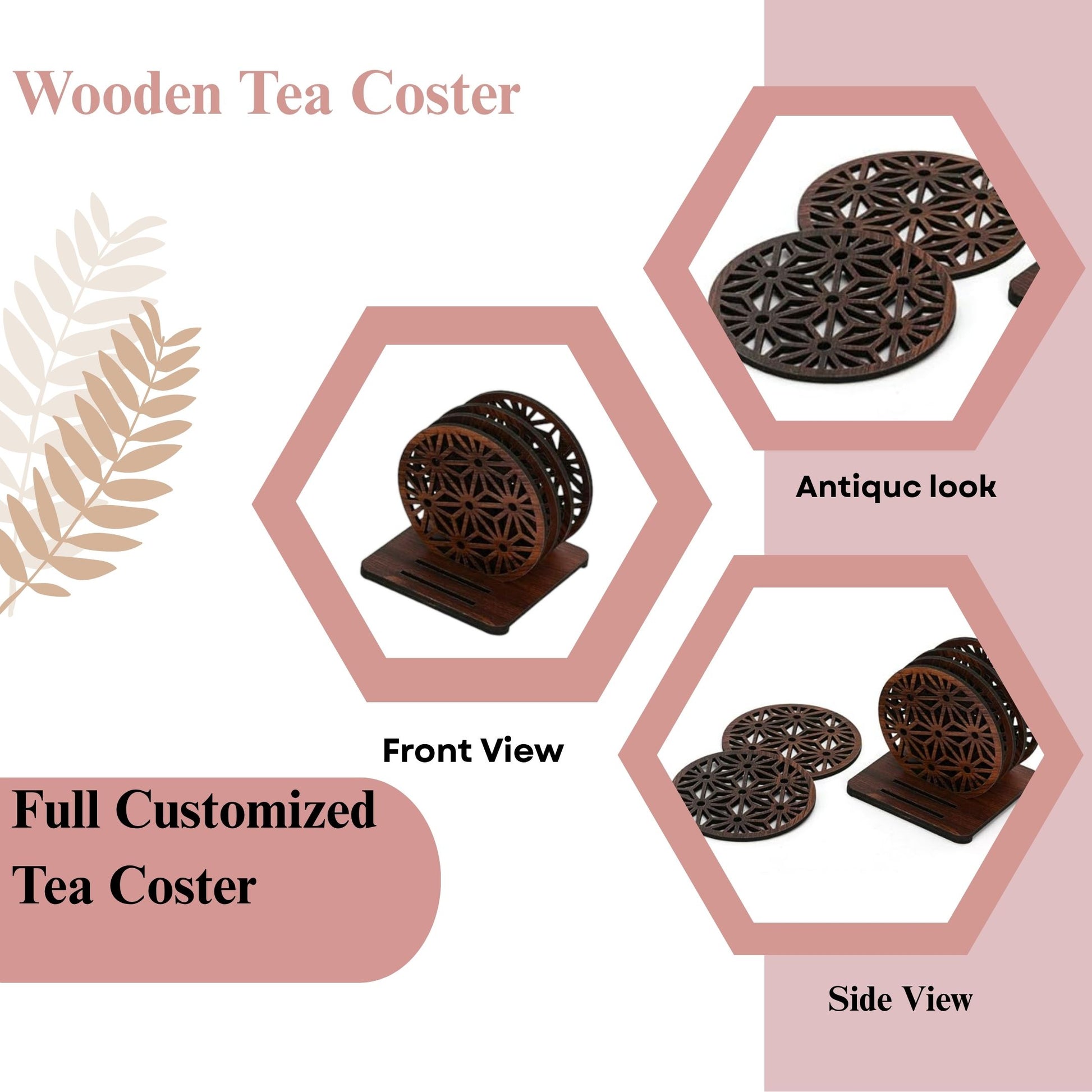 Add timeless charm to your table with this beautifully handcrafted wooden round coaster set featuring intricate geometric floral cutwork. The symmetrical pattern blends traditional artistry with a modern touch, while the deep dark walnut finish enhances its elegance. Complete with a matching rectangular holder, this set not only protects surfaces from moisture and heat but also serves as a stylish décor piece for your home, café, or office.