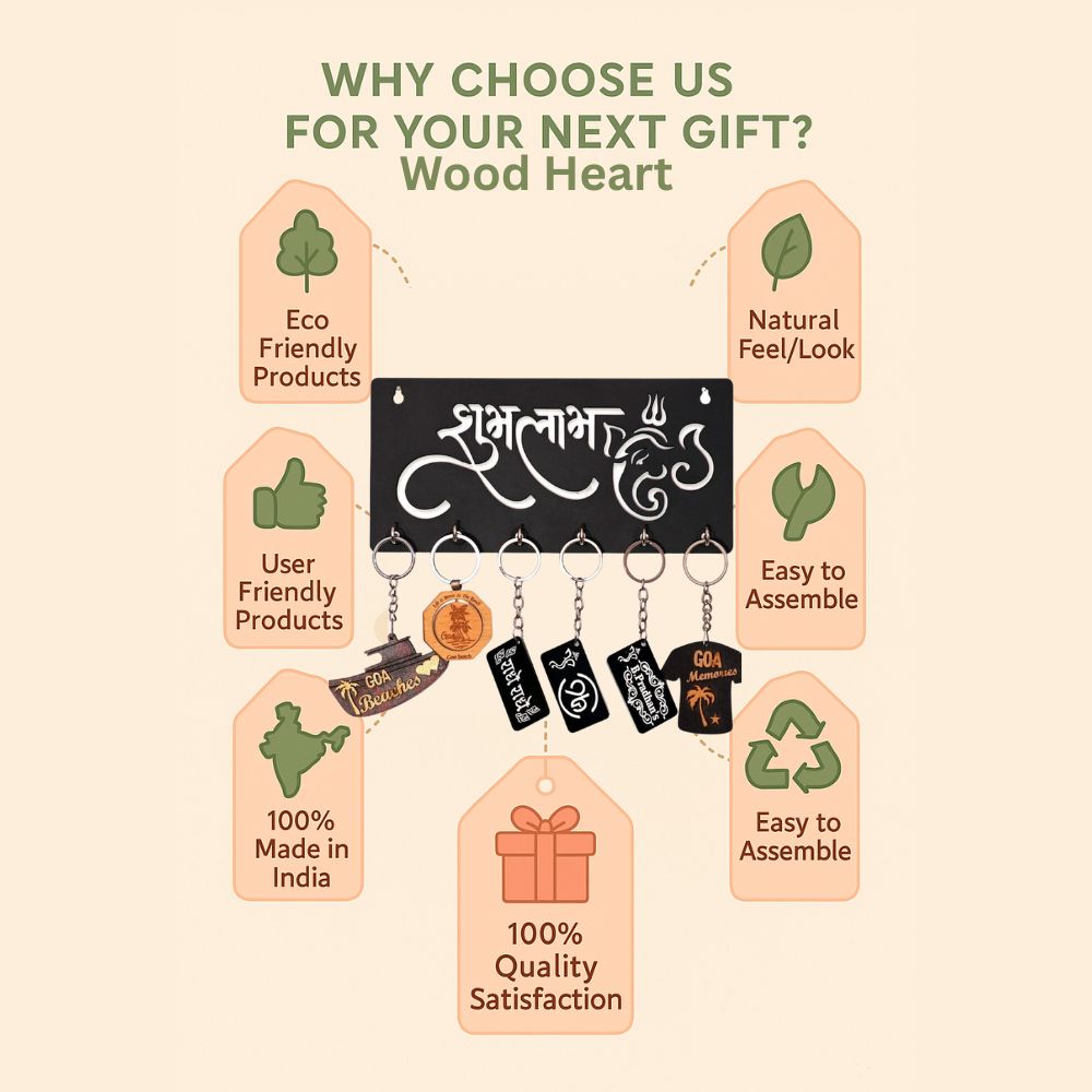 Bring divine positivity and organized living into your home with the WoodHeart Shubh Labh Ganesha Key Holder. Featuring a beautifully carved "Shubh Labh" inscription in Hindi along with Lord Ganesha's artistic outline, this wall-mounted key holder blends spirituality with practicality. It’s perfect for your entrance area, living room, or office space.