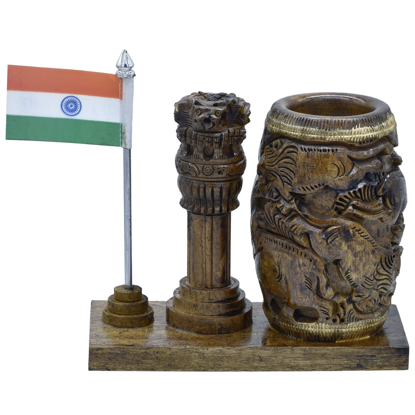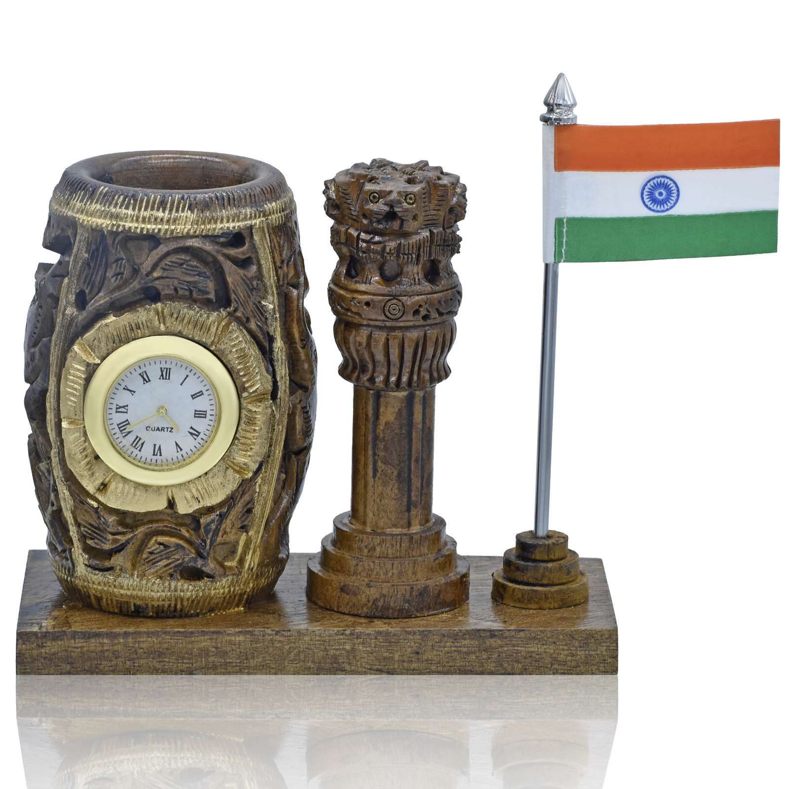 A beautifully crafted wooden desk organizer featuring an antique-style pen holder, Ashoka Pillar replica, miniature Indian flag, and an embedded clock. A perfect combination of utility and patriotism for your workspace or gifting purposes.