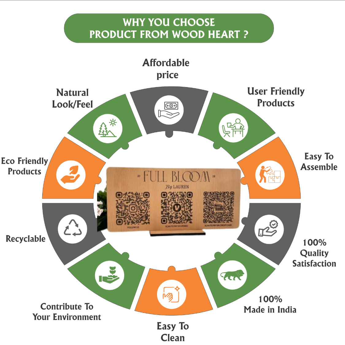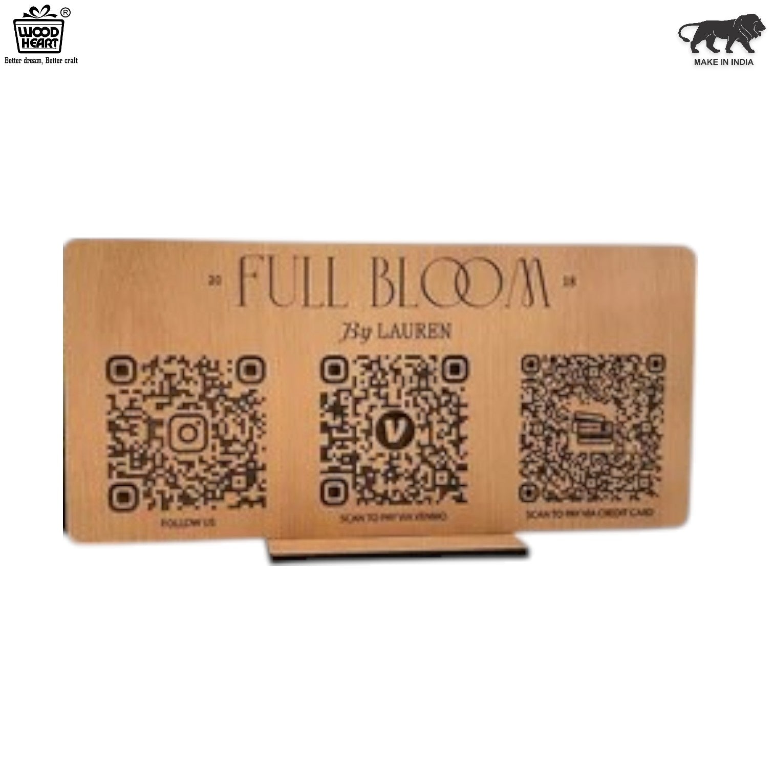 A sleek and professional wooden display stand designed to showcase multiple QR codes for social media, payments, or promotions. This laser-engraved stand combines elegance with functionality, making it perfect for boutiques, cafes, salons, or event counters. Its minimalist design ensures your brand and QR codes stand out, offering a convenient and stylish way for customers to connect and pay.