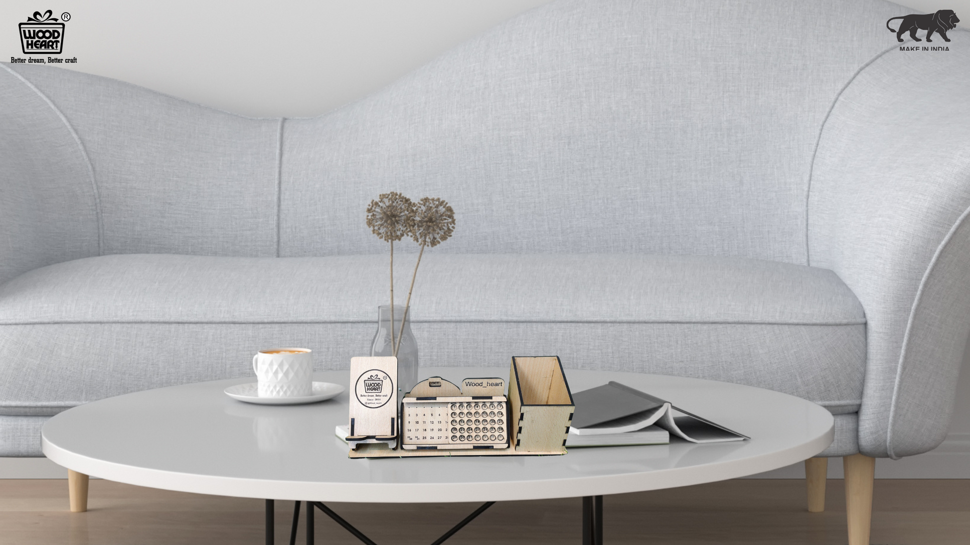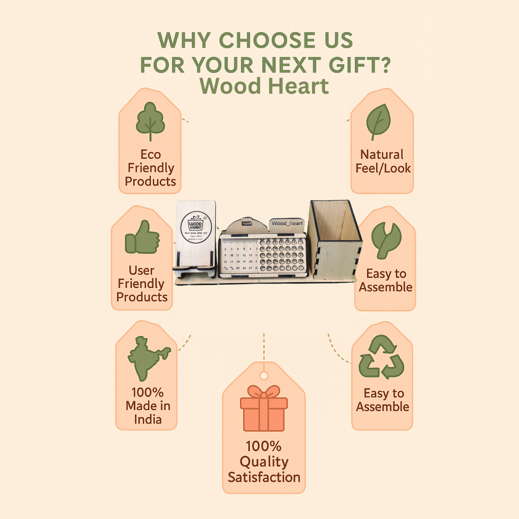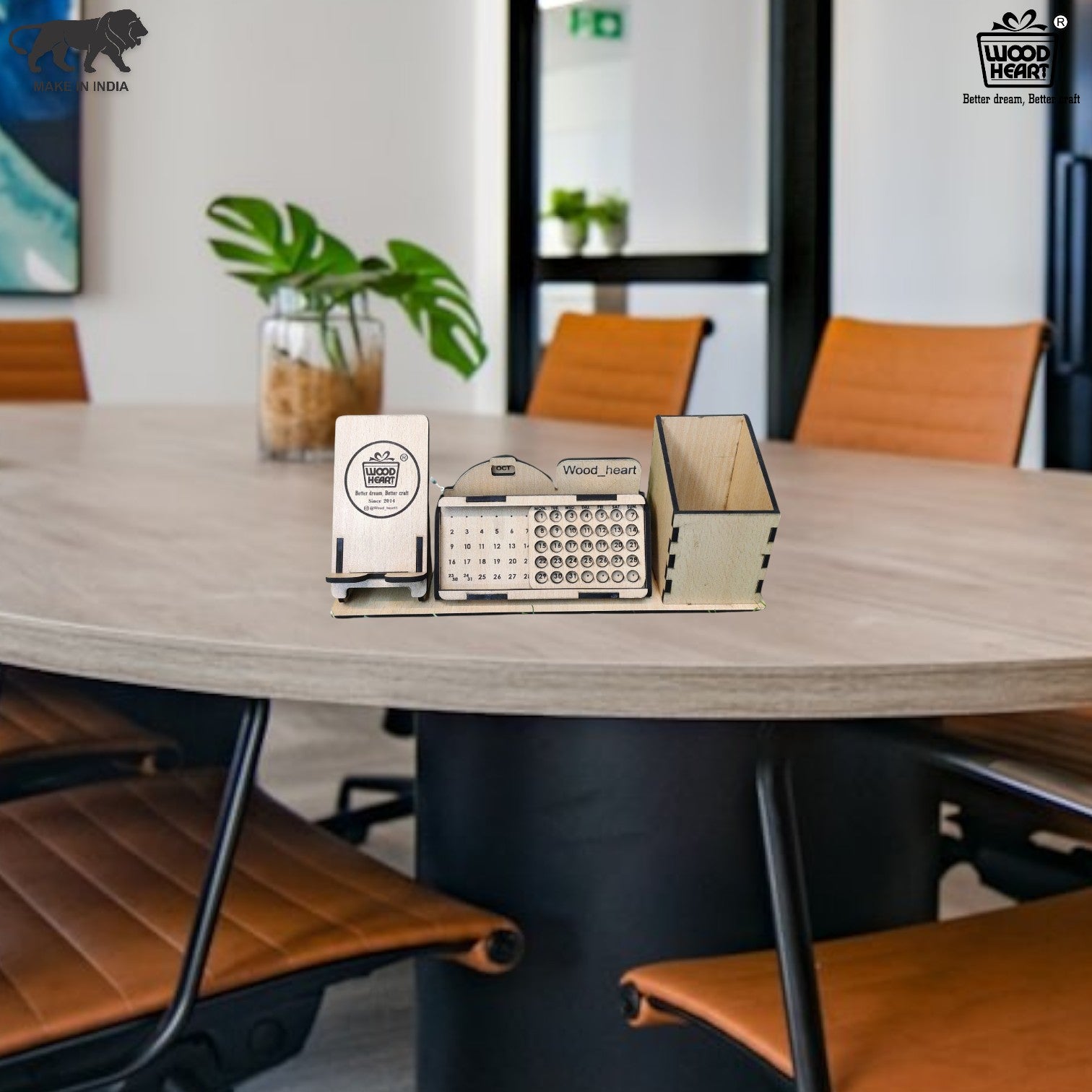Organize your desk in style with the WoodHeart 3-in-1 Wooden Desk Organizer. Thoughtfully designed to combine utility with elegance, this multifunctional piece features a perpetual wooden calendar, a sturdy pen stand, and a stylish mobile holder. Perfect for office desks, study tables, and gifting purposes, it adds a touch of handcrafted charm to your workspace.